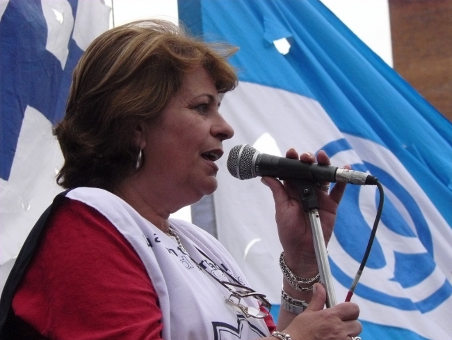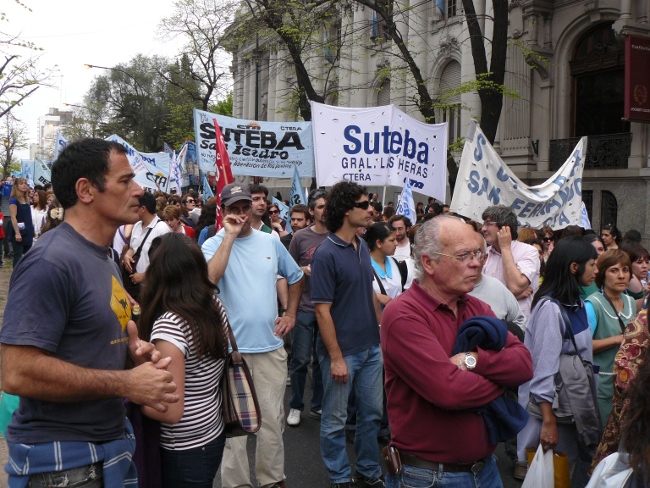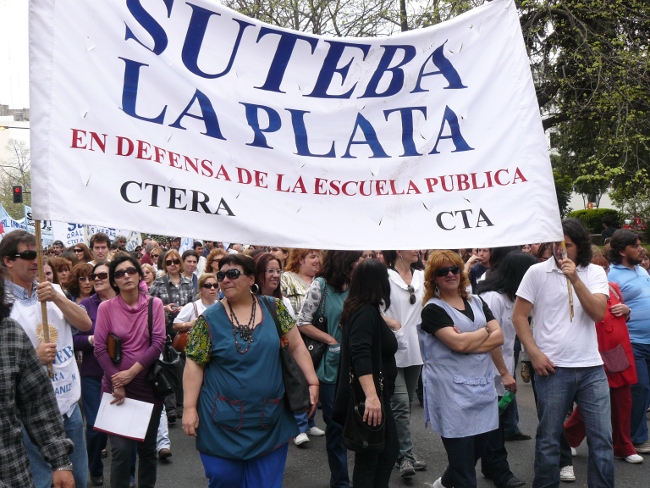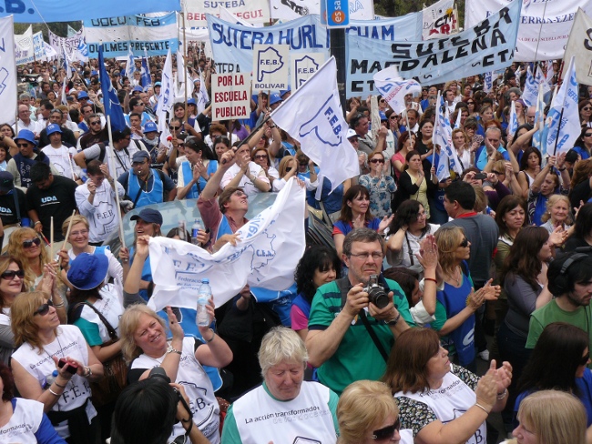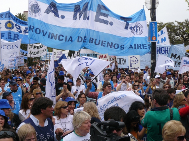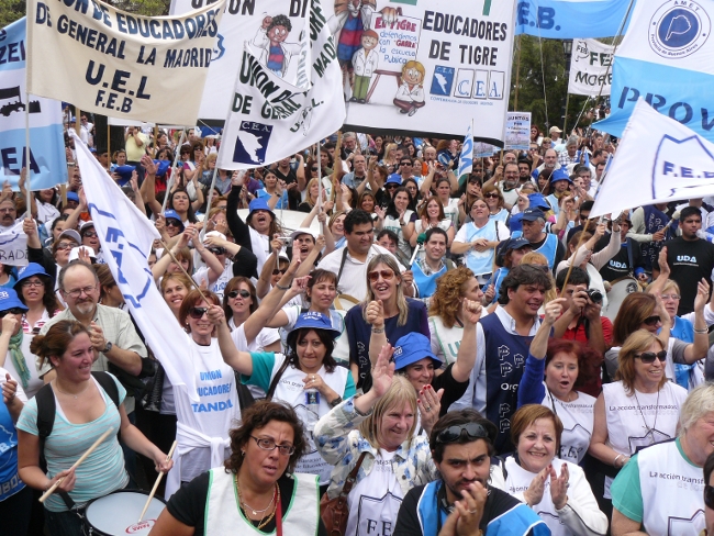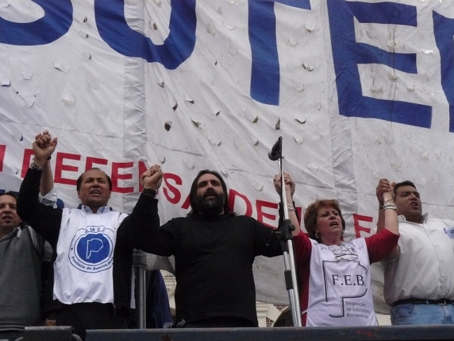 “Estamos acá para plantear muy claramente al gobernador Daniel Scioli: queremos que se abran las paritarias en la provincia de Buenos Aires. Hace poco más de dos meses, la Nación le condonó la deuda a la provincia de Buenos Aires. Entonces, el Gobierno de la provincia de Buenos Aires está en condiciones de hacerse cargo de los reclamos de los trabajadores. Y si no hay voluntad política de la Provincia, hay voluntad política de los trabajadores. Por eso compañeros, no se puede desconocer la pérdida del poder adquisitivo de nuestro salario. Queremos discutir aumento salarial, pero también que les paguen el salario familiar a todos los docentes que están siendo discriminados. El salario familiar es un derecho universal. También las ganancias se las tienen que cobrar a aquellos que tienen plata, no al salario de los trabajadores. Todo esto lo queremos discutir en paritarias. Lo mismo ocurre con los cargos docentes: Está bien que se hayan nombrado cargos para Educación Especial, y la creación de cargos para Educación Artística y Educación Física. Pero también queremos la creación de cargos para bibliotecarios, equipos de orientación escolar, preceptores y personal jerárquico en todas las escuelas de la provincia de Buenos Aires.