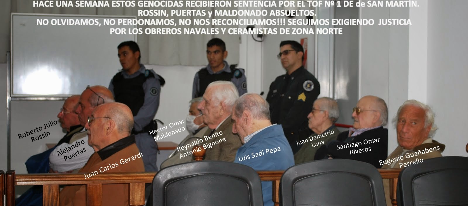 Por la tarde se dio a conocer el veredicto, en el cual hubo tres absoluciones; de los cuatro miembros de la Prefectura imputados, solo fue condenado el de mayor rango: Juan Carlos Gerardi, quien deberá cumplir 9 años de prisión por un allanamiento ilegal, cuatro secuestros y reiteradas torturas. Mientras que los ex generales Santiago Omar Riveros y Reynaldo Benito Antonio Bignone, fueron condenados a prisión perpetua y a 23 años de prisión respectivamente en el juicio por delitos de lesa humanidad en el que se ventilaron los secuestros y desapariciones de 32 obreros de las plantas de los astilleros Astarsa y Mestrina y de las cerámicas Lozadur y Cattáneo.
