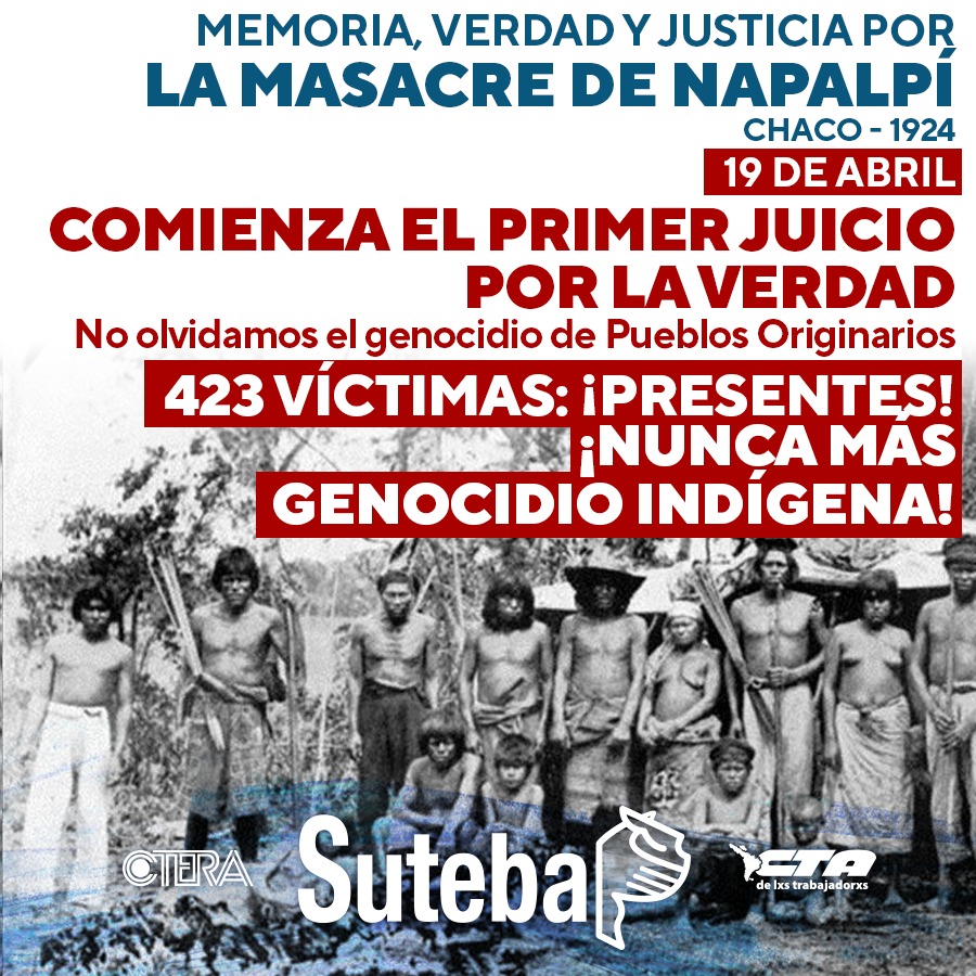 Como parte del proceso de reconocimiento del genocidio cometido contra los pueblos originarios y la búsqueda de reparación a las víctimas, sus familias y Comunidades; este martes 19 de abril se dará inicio al primer e histórico Juicio por la Verdad por la Masacre de Napalpí, un debate oral y público que investigará como crímenes de lesa humanidad el fusilamiento de miembros de las comunidades qom y moqoit en 1924 en Chaco. Las audiencias se trasmitirán a través de medios digitales para garantizar el acceso.