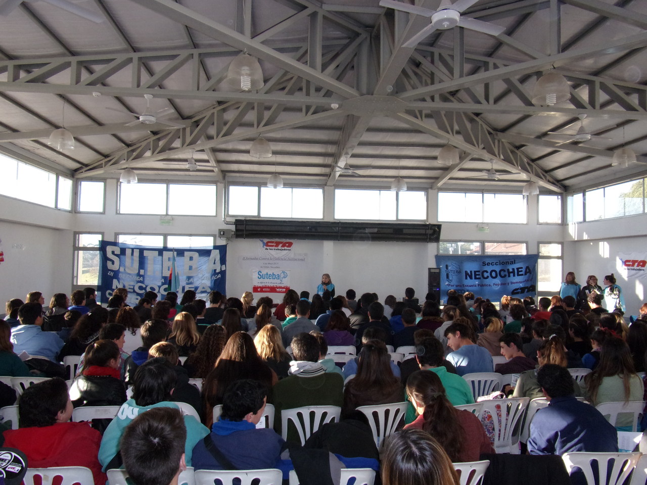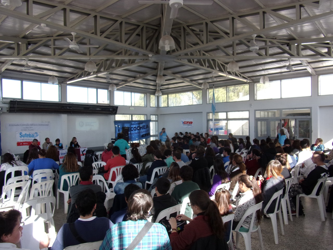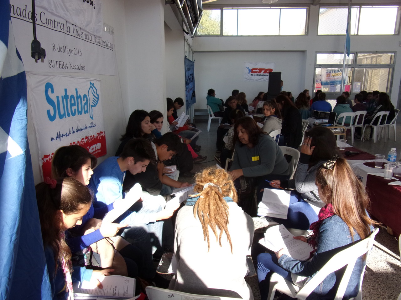 El viernes 8 de mayo, en el marco del "Día Nacional de la Lucha Contra la Violencia Institucional", el SUTEBA Necochea organizó la II Jornada contra la Violencia Institucional. Dicha jornada que se desarrolló en la EEST Nº1, contó con la participación de unos 150 jóvenes representantes de todas las escuelas secundarias y terciarias del distrito acompañados por sus docentes.