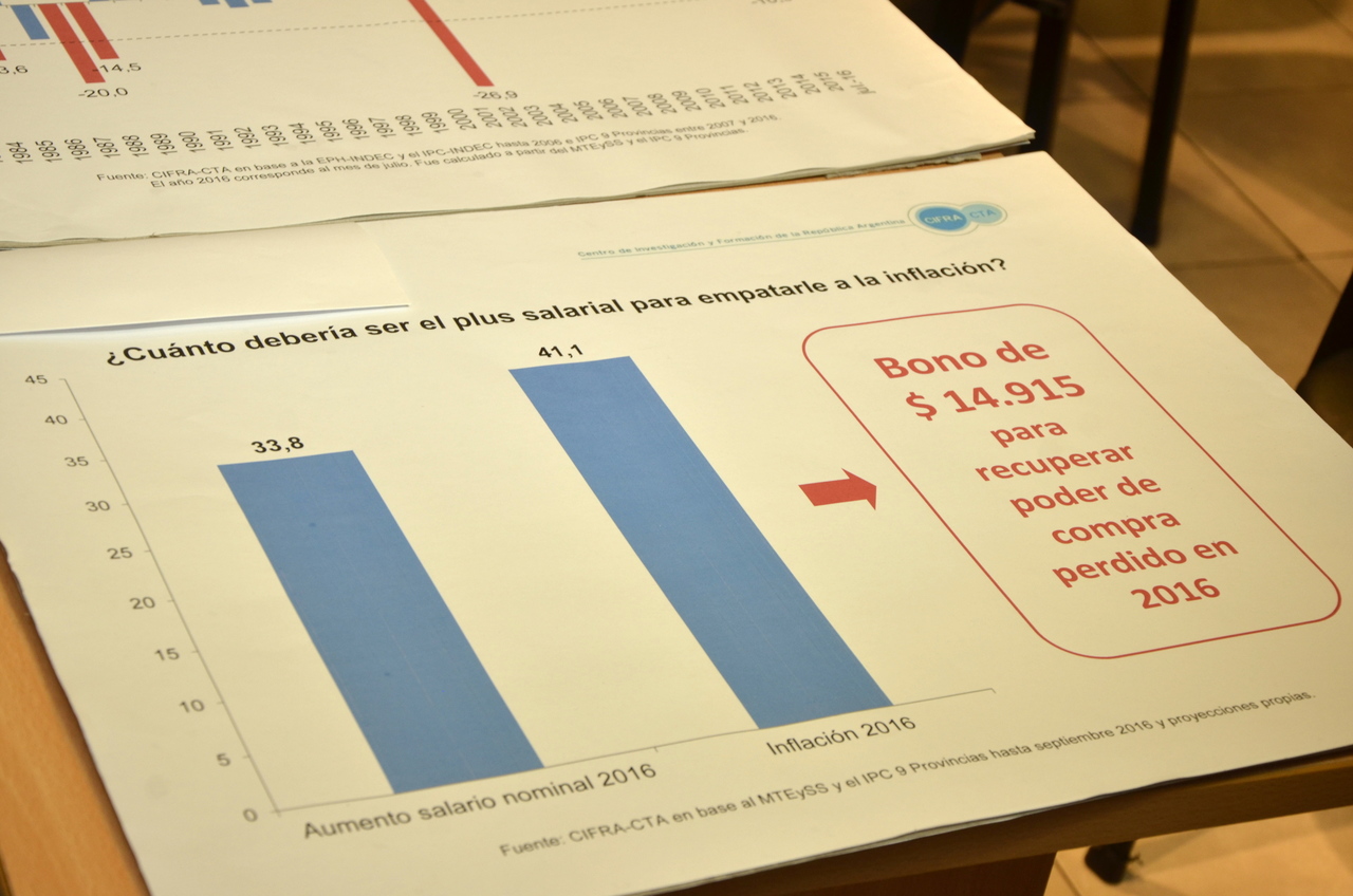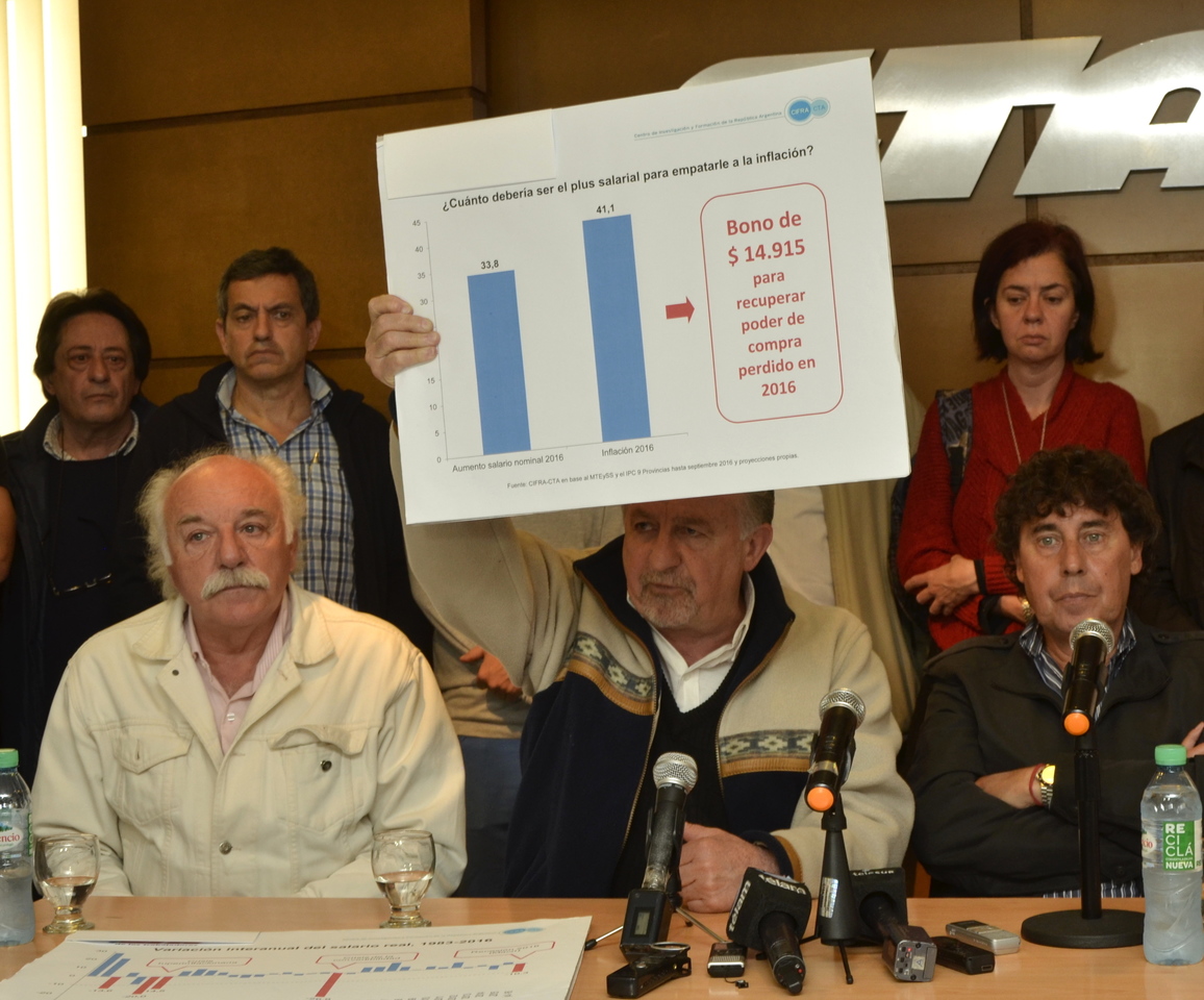"Nosotros volvemos a ratificar que un bono no cierra la enorme brecha salarial que se generó durante este año. Vamos a seguir exigiendo que se reabran las paritarias para recuperar el salario que perdimos por la devaluación, el tarifazo, la inflación y el ajuste", enfatizó Hugo Yasky.