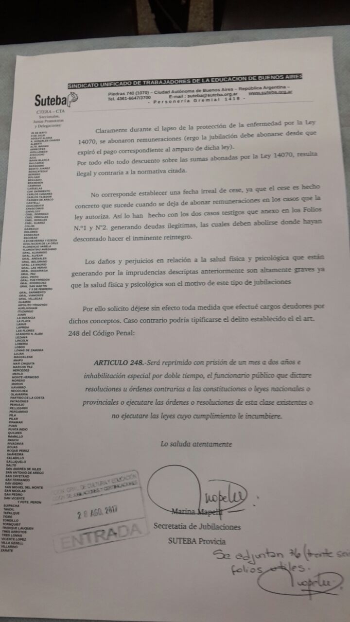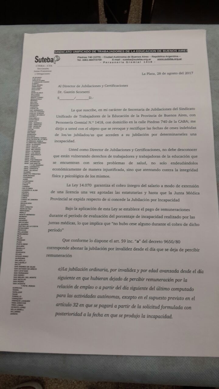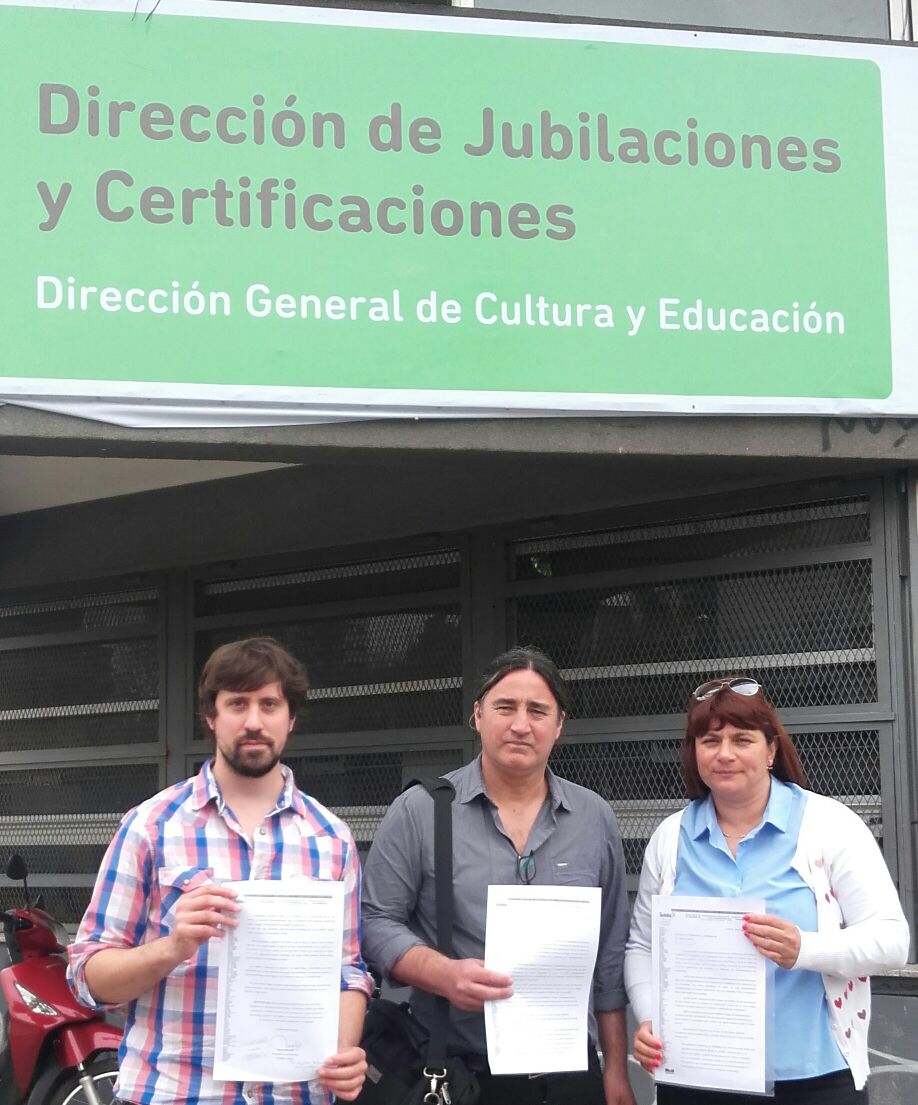 En representación del SUTEBA, Marina Mapelli, Secretaria de Jubilaciones; Patricio Villegas, Secretario General del SUTEBA La Plata; y el Secretario de Jubilaciones del SUTEBA La Plata, Hernán Parra, realizaron una presentación formal del reclamo por nota al Director de Jubilaciones y Certificaciones, Gastón Scorsetti, en la que se presentaron dos casos testigos, uno de Morón y otro de La Plata, exigiendo una solución integral para todos lxs Docentes en igual situación en toda la Provincia.