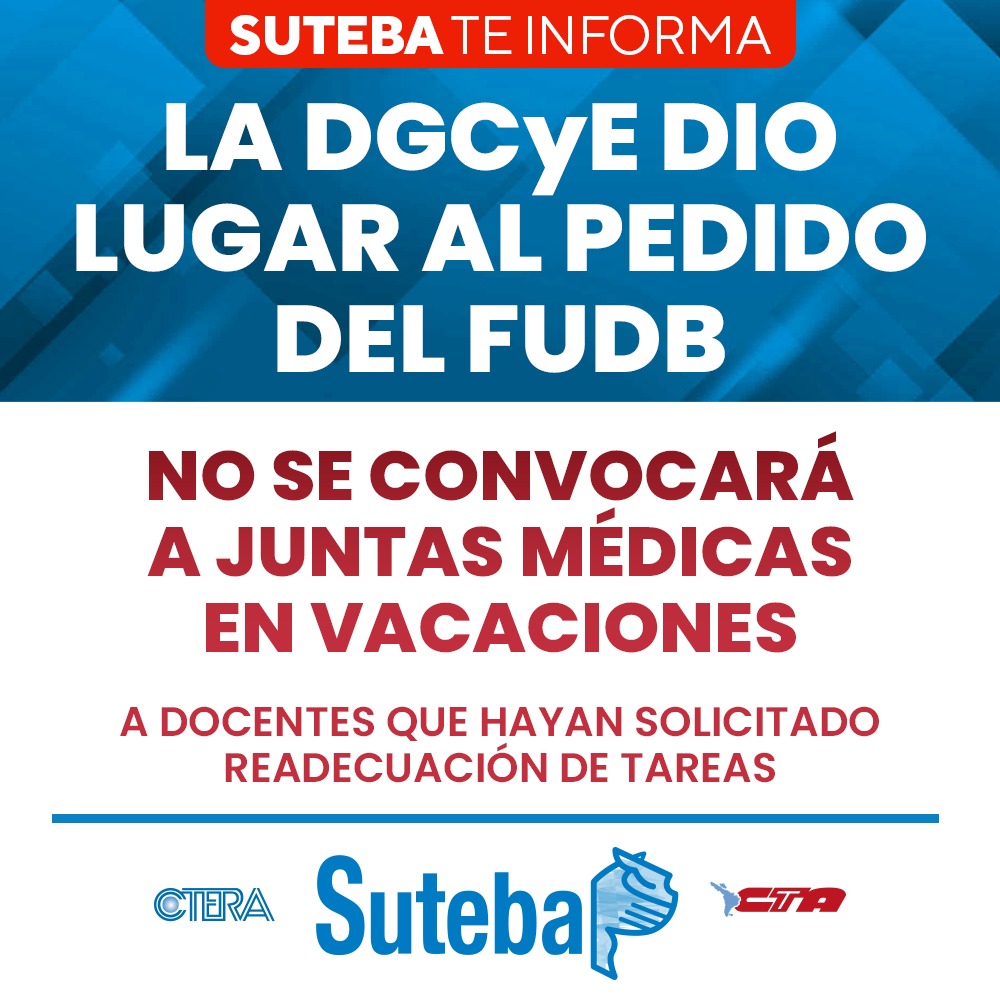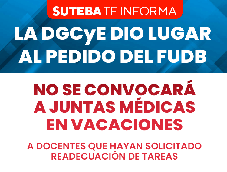 La Dirección General de Cultura y Educación (DGCyE) respondió favorablemente una solicitud del Frente de Unidad Docente Bonaerense (FUDB) para que no se convoque a juntas médicas en vacaciones a Docentes que hayan solicitado readecuación de tareas.