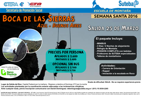 Esta Semana Santa la Escuela de Montaña de SUTEBA te propone una experiencia única, en Boca de las Sierras, Azul. El viaje comienza el viernes 25 de marzo por la mañana y el regreso es el domingo 27.