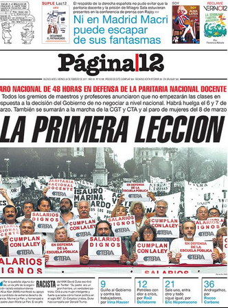 Tal como venían las cosas, era imposible que no pasara: los docentes votaron un paro nacional de 48 horas para el inicio de las clases, el lunes 6 y martes 7 de marzo. La decisión del Gobierno de eliminar la paritaria federal que se realizaba todos los años desde el 2008 -en la que se acordaba el piso salarial de todos los maestros del país-, empujó a los cinco sindicatos docentes nacionales a lanzar el plan de lucha. Huelga de 48 horas y adhesión al paro internacional de mujeres del miércoles 8, la primer semana; jornadas informativas con los padres, la segunda; en caso de que no haya respuestas, un nuevo paro de 48 horas para la tercer semana, con una marcha a la Plaza de Mayo.