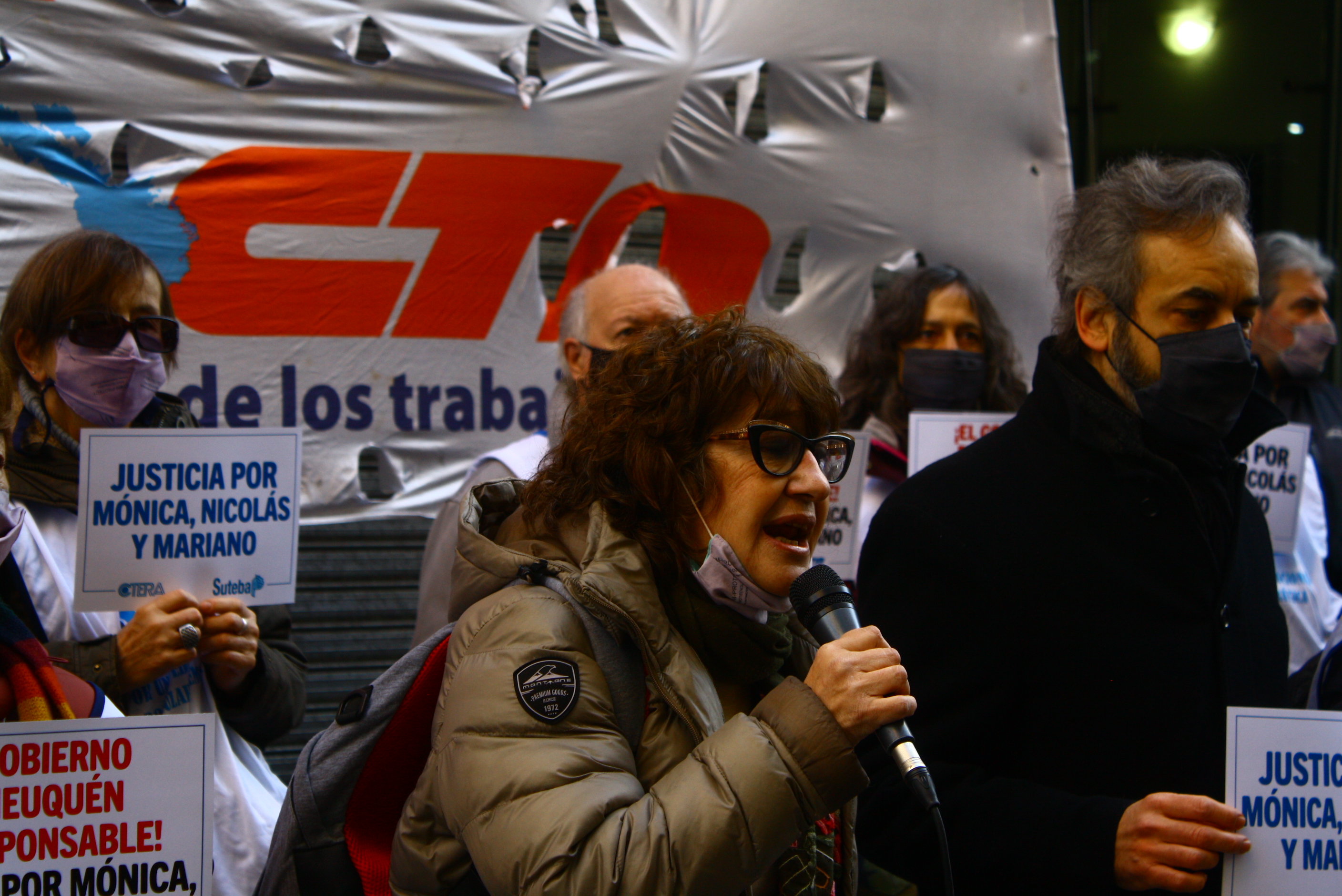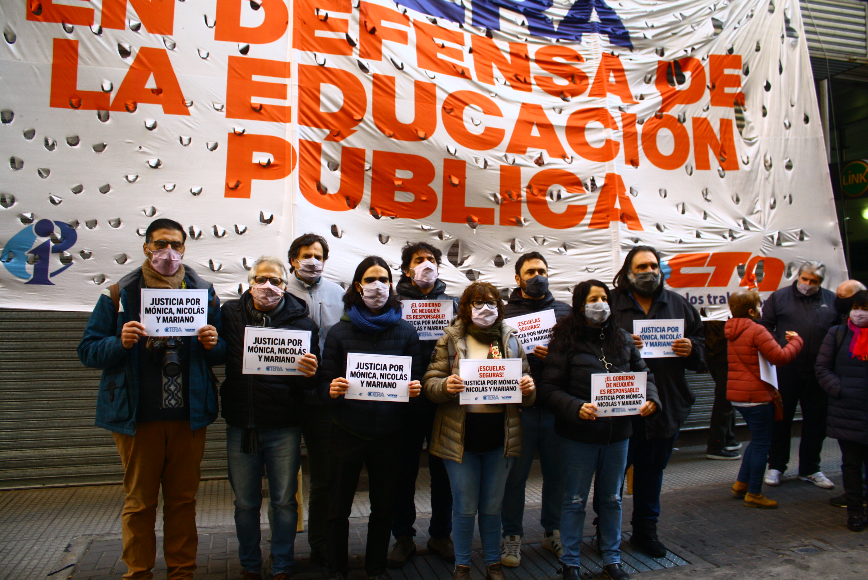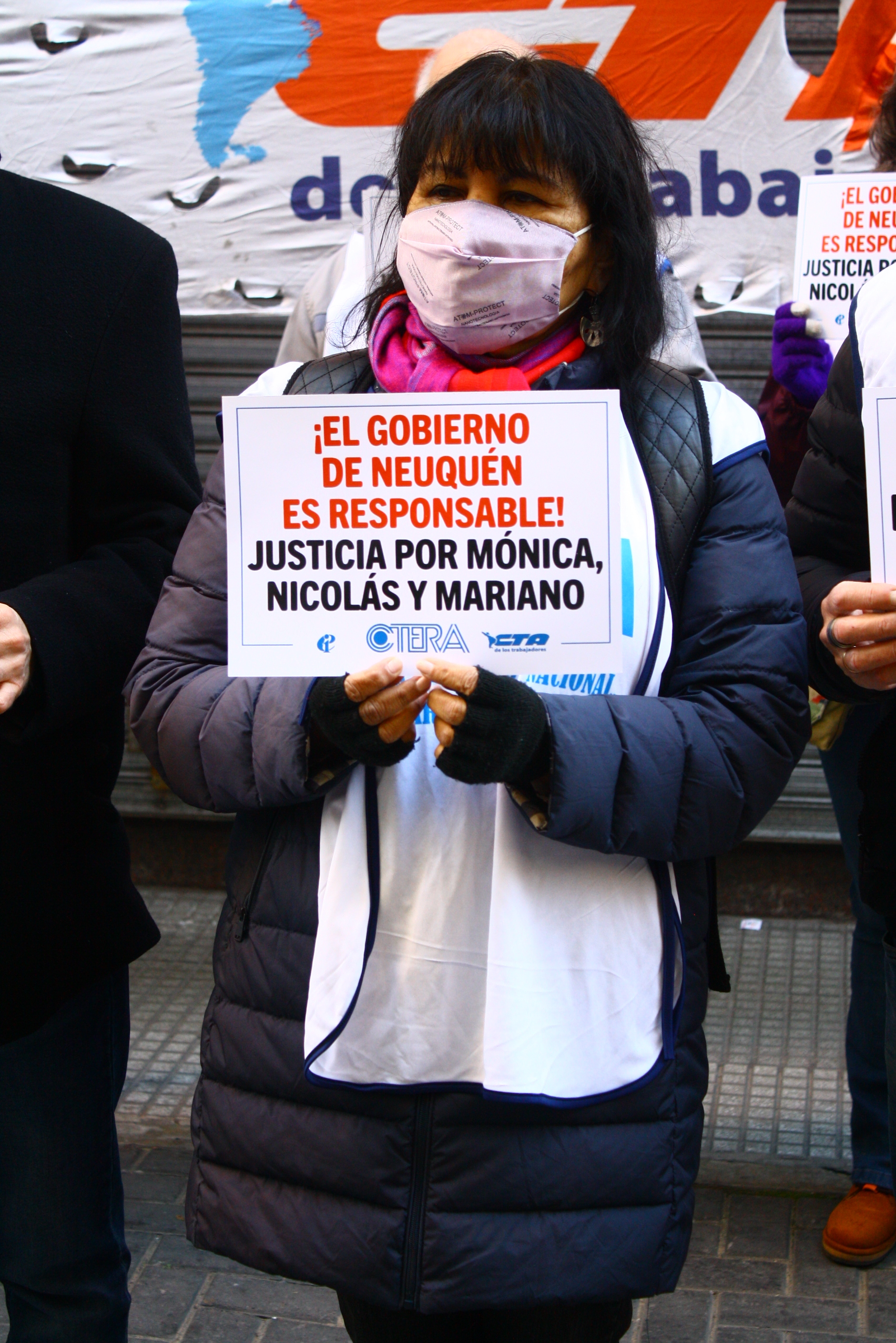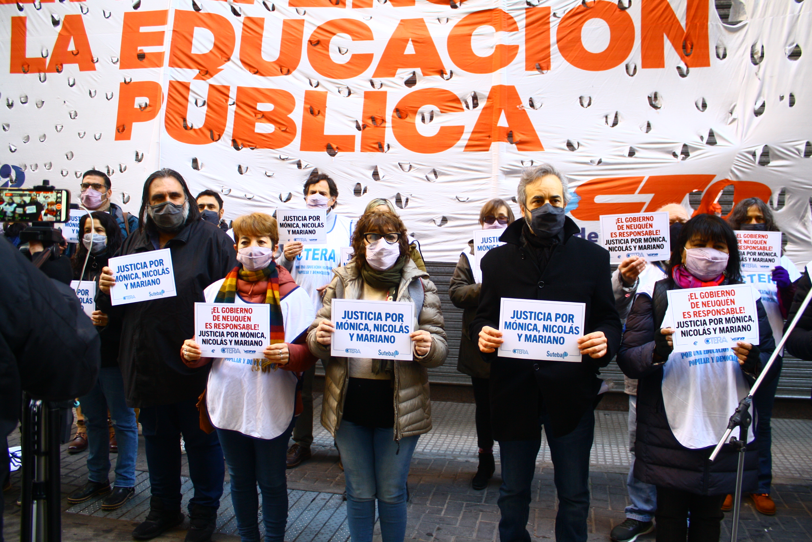 CTERA, encabezada por Sonia Alesso – Secretaria General – y Roberto Baradel – Secretario General Adjunto –, se concentró frente la Casa de la Provincia de Neuquén en la Ciudad de Buenos Aires, para exigir Justicia, Escuelas seguras y solidarizarse con las familias, lxs compañerxs de la Escuela y ATEN, en su lucha por esclarecer los hechos y reclamar justicia por Mónica, Nicolás y Mariano.