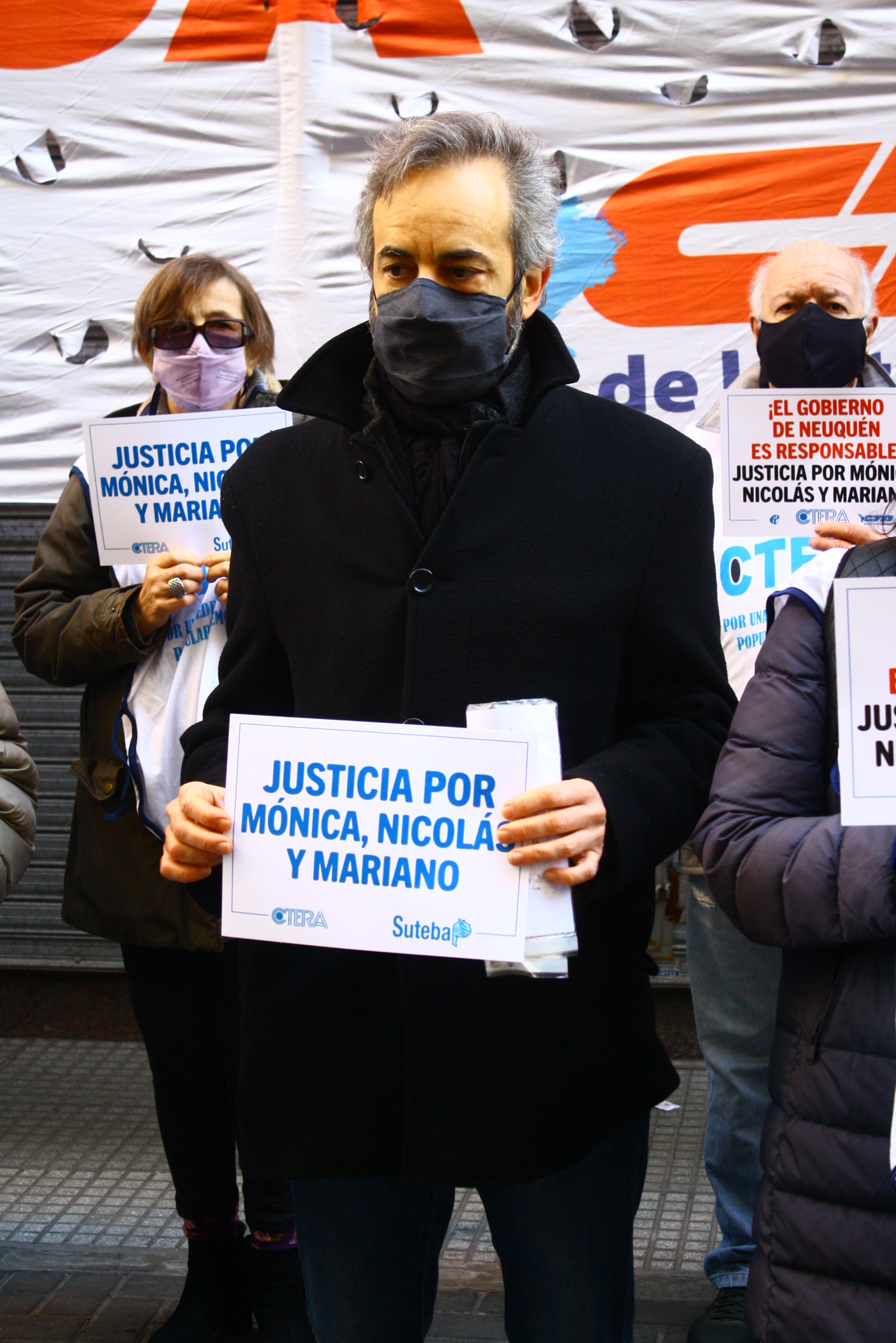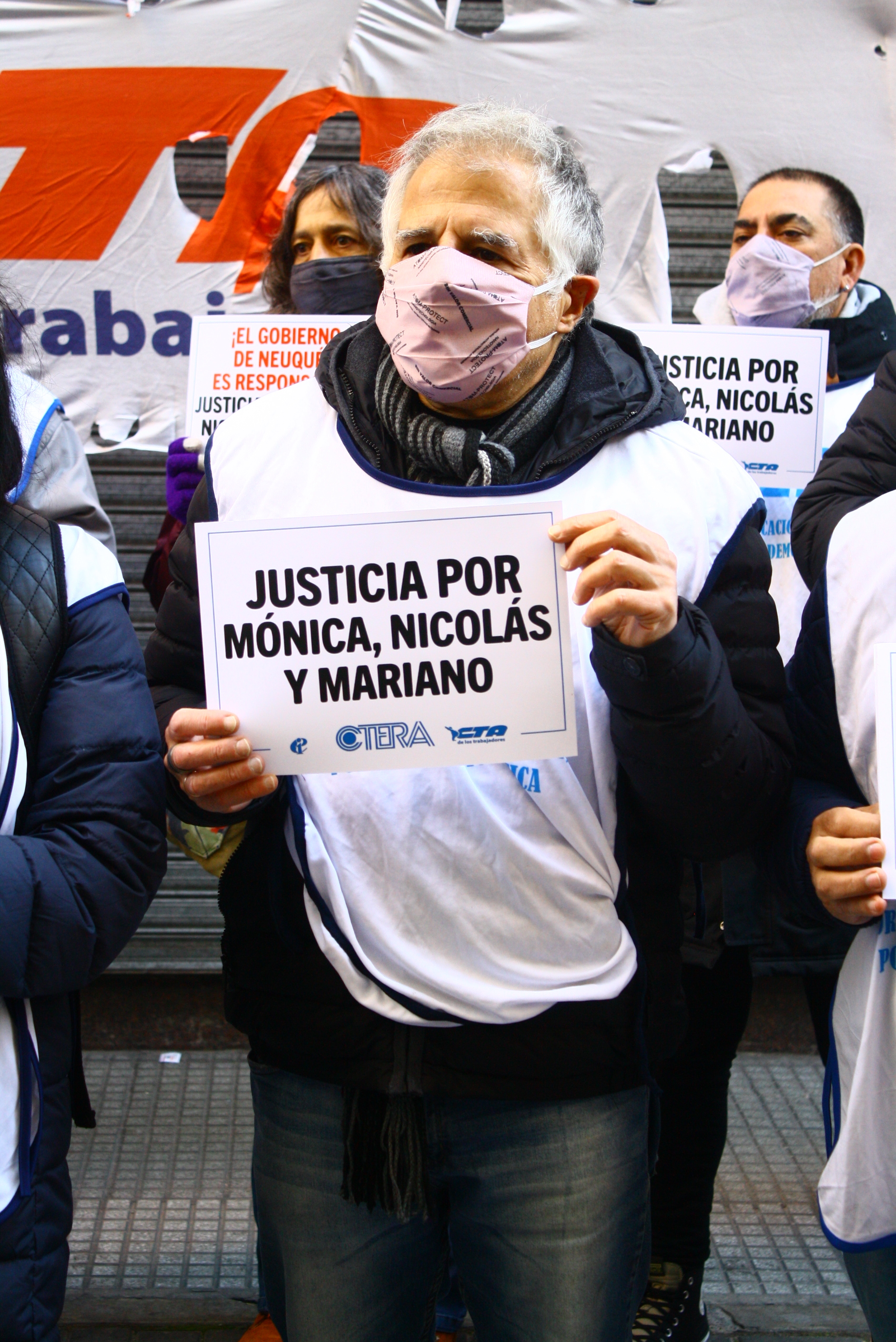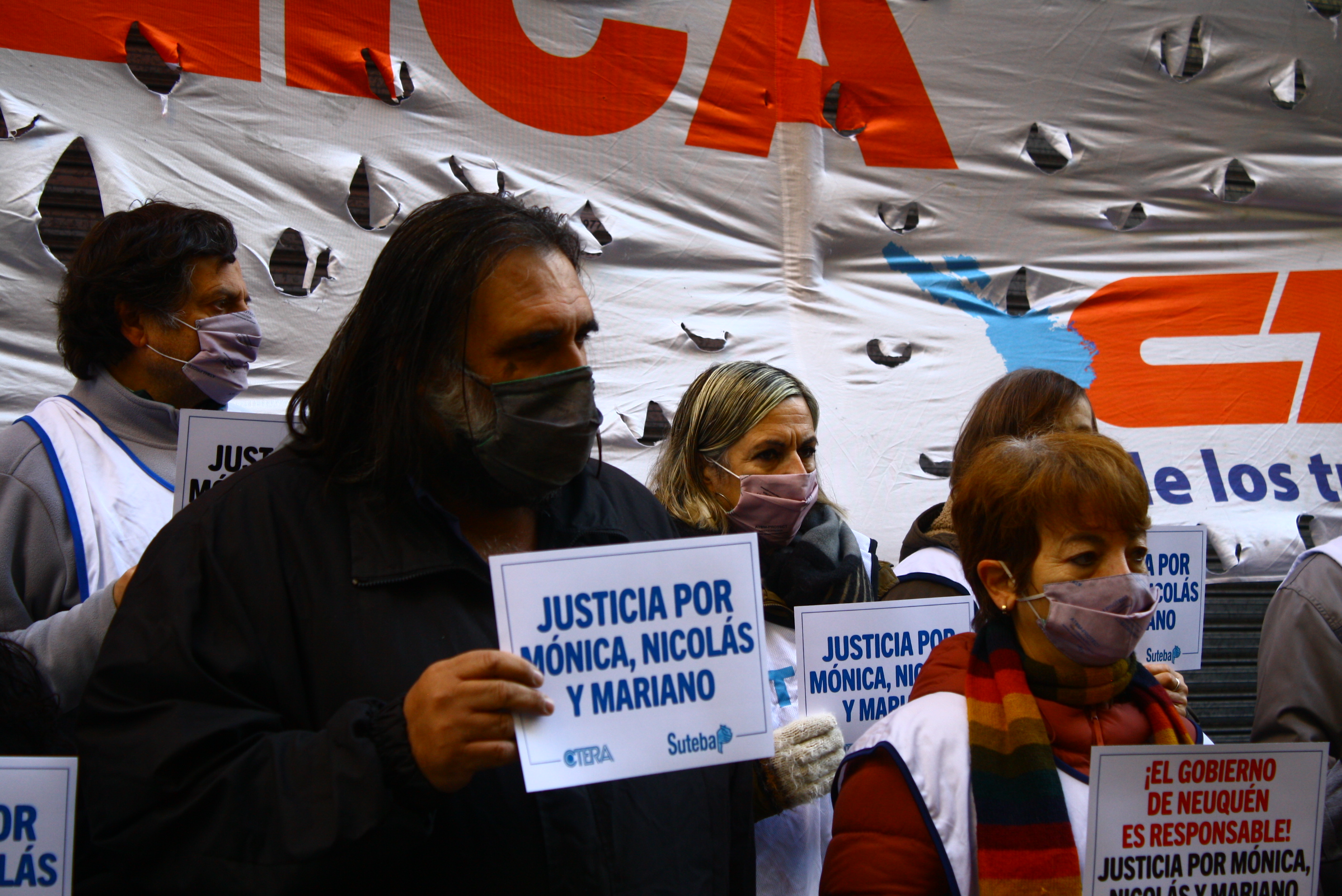 CTERA, encabezada por Sonia Alesso – Secretaria General – y Roberto Baradel – Secretario General Adjunto –, se concentró frente la Casa de la Provincia de Neuquén en la Ciudad de Buenos Aires, para exigir Justicia, Escuelas seguras y solidarizarse con las familias, lxs compañerxs de la Escuela y ATEN, en su lucha por esclarecer los hechos y reclamar justicia por Mónica, Nicolás y Mariano.