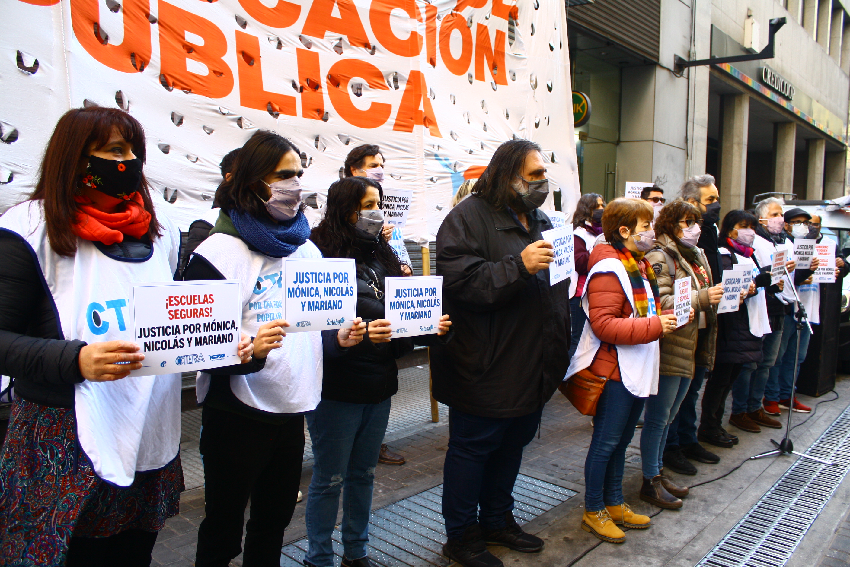 Se realizó la Jornada Nacional de Protesta convocada por CTERA exigiendo Justicia por la Maestra Mónica Jara y los Trabajadores Nicolás Francés y Mariano Spinelli, fallecidxs el 29 de junio por causa de una explosión en la Escuela Albergue 144 de Aguada San Roque, Neuquén, debido a la negligencia del gobierno provincial.