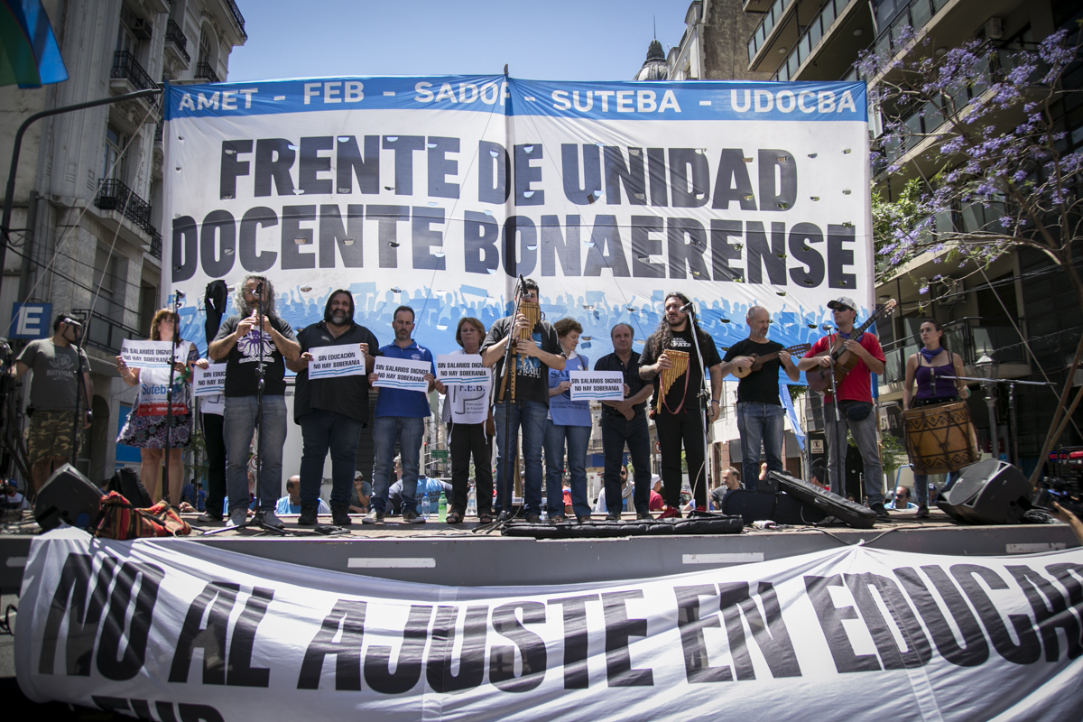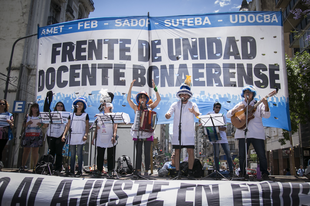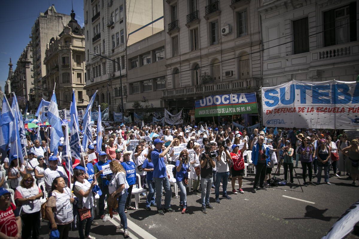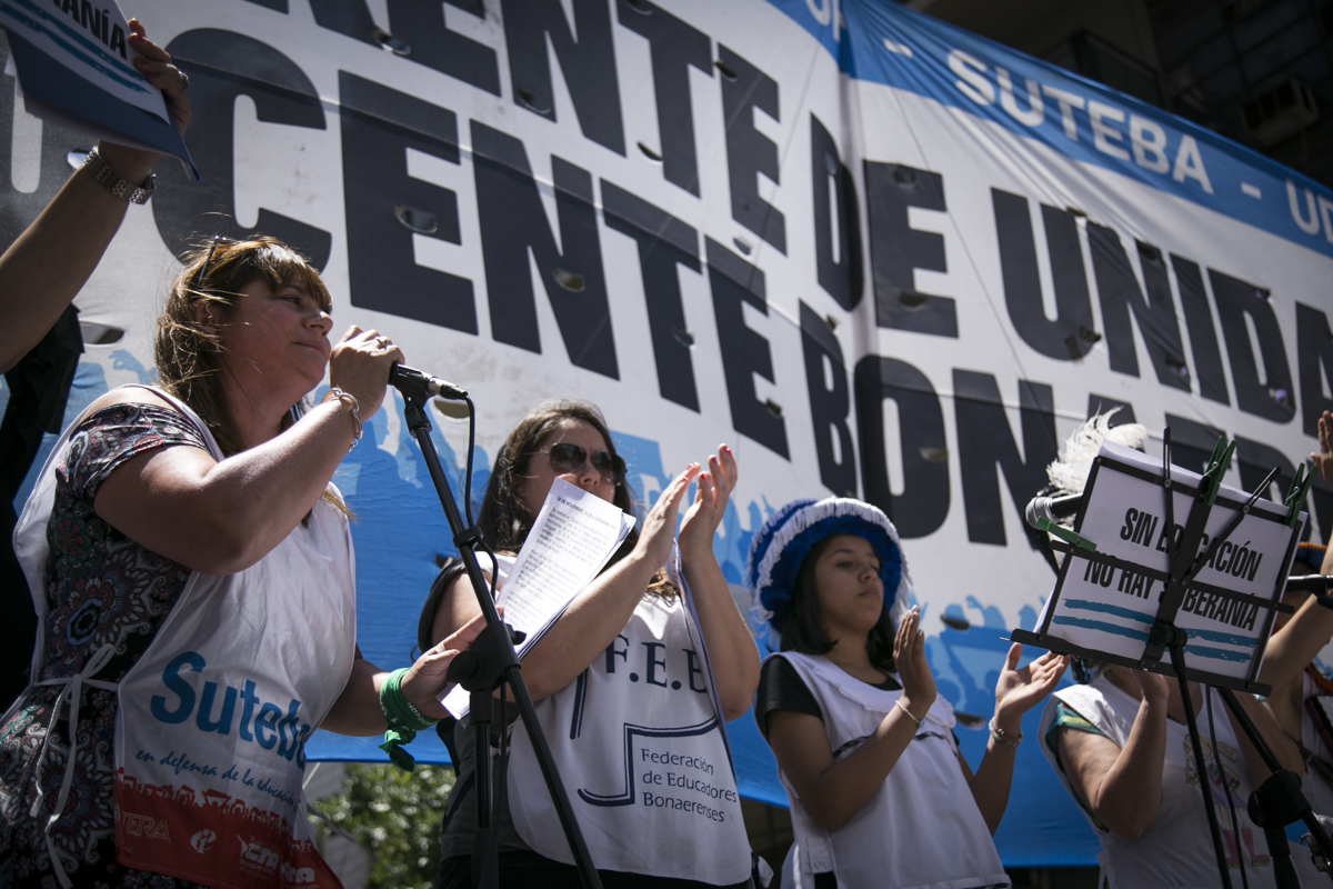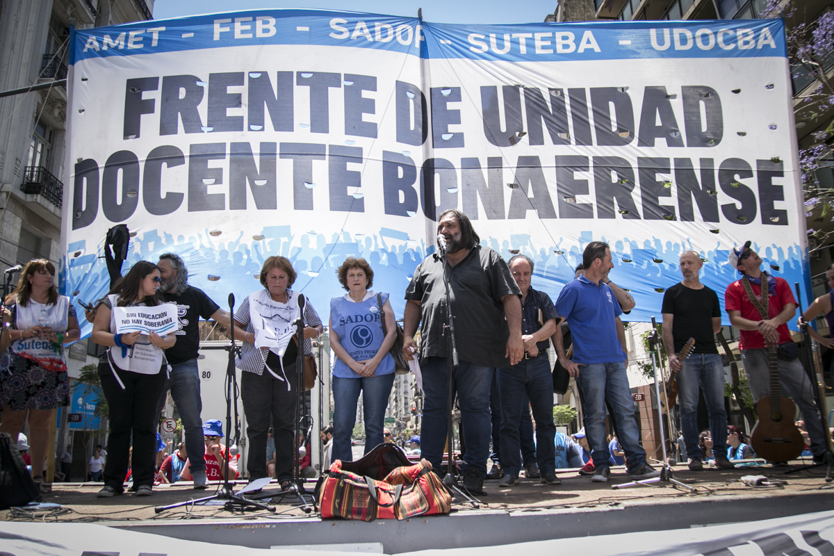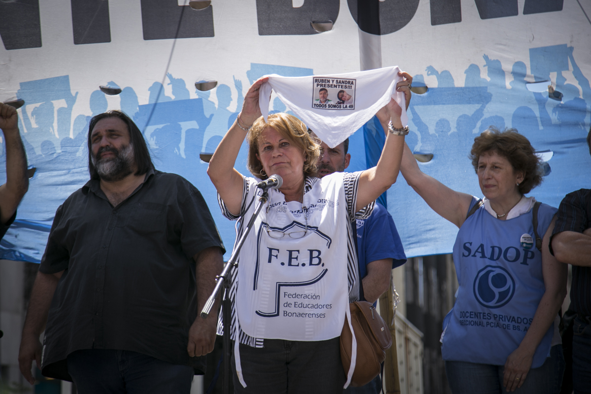 "Lxs Ministrxs y la Gobernadora deben hacerse cargo y resolver las necesidades de lxs Docentes y de las Escuelas bonaerenses. Queremos Escuelas seguras y salarios dignos. Repudiamos los sumarios a los Directivxs y Docentes y exigimos que se termine el amedrentamiento por ejercer el legítimo derecho a huelga. Estamos en alerta por las Escuelas Técnicas, los CFP y la Educación Superior. Y esto hay que decirlo claramente: no se cierra la Paritaria porque Cambiemos quiere bajarle el salario a lxs Trabajadorxs y el FUDB no está dispuesto a aceptarlo. Deben convocarnos y resolver las necesidades de la Escuela Pública, porque si así terminamos este año, no empezamos el año que viene. Y el Gobierno Nacional debe convocar a CTERA a discutir Paritarias, si no lxs Docentes de todo el país vamos a parar para exigirla", culminó Baradel.
