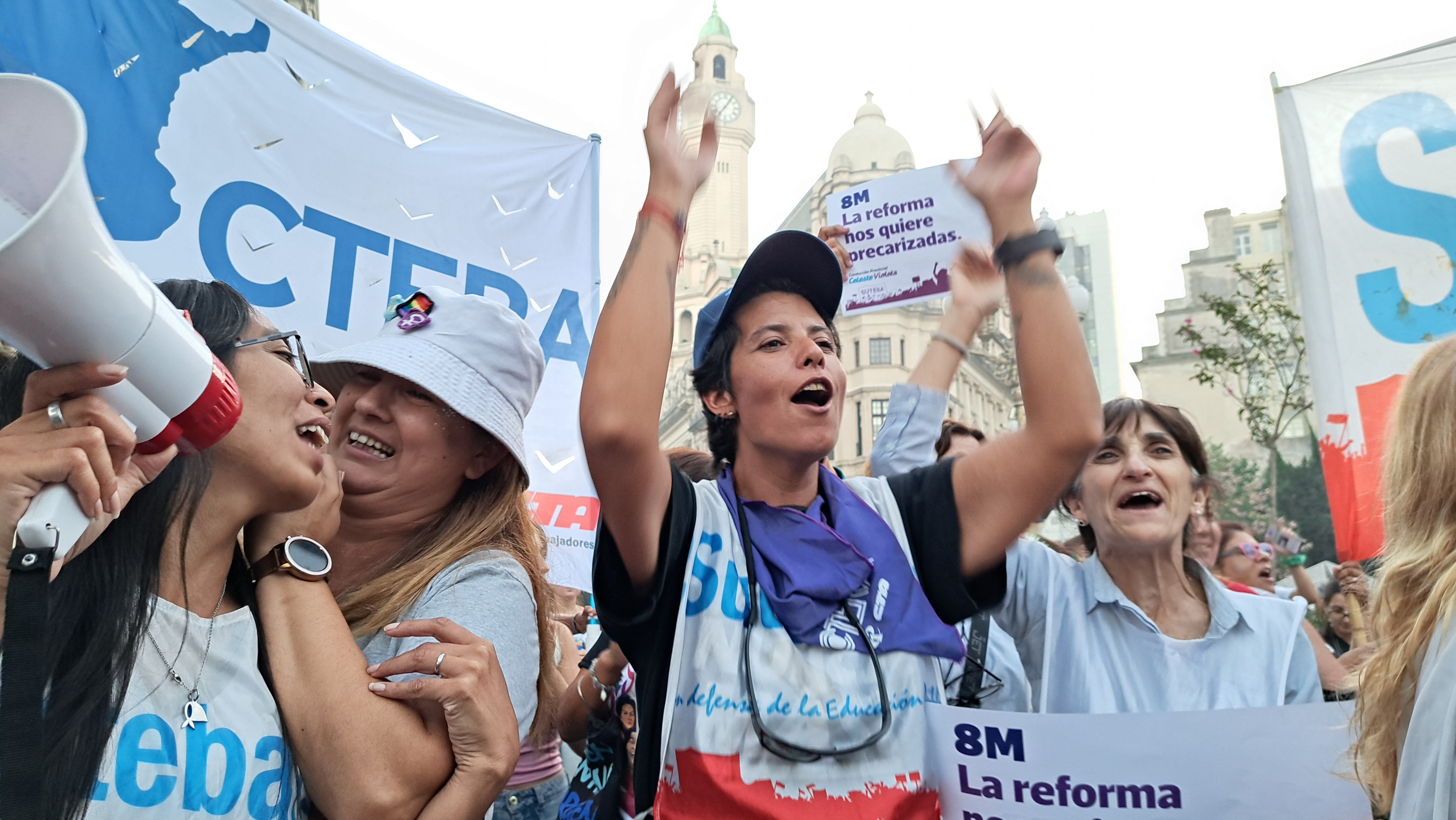 Cristina Echegoyen, Secretaria de Igualdad de Géneros y Diversidades: "Este 8M nos encuentra más unidas que nunca, fortalecidas como bloque sindical. Todos los Sindicatos de todas las Centrales estamos marchando, reclamando como siempre que se respeten nuestros derechos como Trabajadoras, pero sobre todo en contra de la reforma laboral. No vamos a ser la moneda de cambio en este proyecto de país que impulsa el Gobierno Nacional".