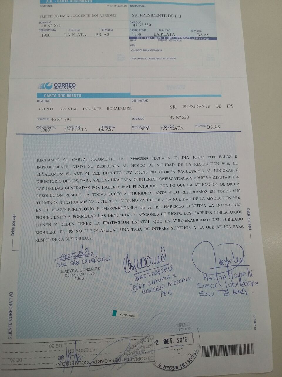 Ante la falta de respuesta por parte del Directorio, el día 28 de Julio, en la ciudad de La Plata, el Frente Gremial Docente Bonaerense realizó la presentación de una carta documento dirigida al Presidente del Instituto de Previsión Social exigiendo la inmediata nulidad de dicha resolución
