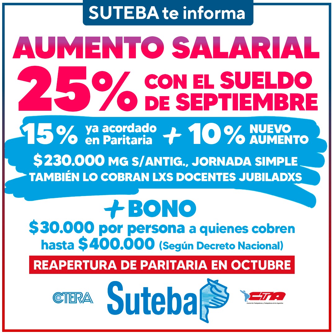 Lxs Docentes de la provincia de Buenos Aires percibiremos un 25% de incremento a cobrar con el sueldo de septiembre, compuesto por un 15% ya acordado en paritaria más un 10% de nuevo aumento. La mejora salarial alcanza también a lxs Docentes Jubiladxs.