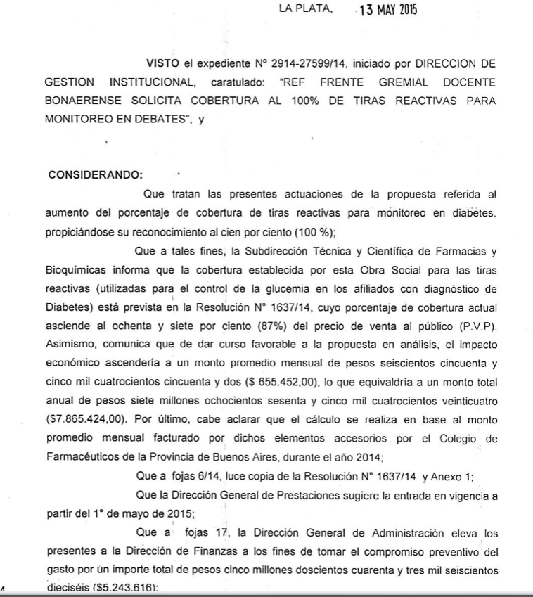 SUTEBA viene exigiendo este derecho permanentemente a través de su Vocalía Docente y en el Consejo Consultivo del IOMA. Hasta ahora se cubría el 87% del precio de venta al público (P.V.P). El pasado 13 de mayo se firmó la Resolución que propicia el reconocimiento al 100% de las tiras reactivas para el control de glucemia en los afiliados con diagnóstico de diabetes. Este 100 % es sobre el P.V.P, lo cual significa que la cobertura se actualizará automáticamente cuando se modifique el precio de venta.