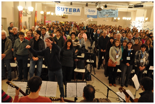 A las 12 terminó el panel luego del almuerzo, los docentes empezaron a trabajar en comisiones. Alrededor de las 16 horas, finalizó con gran entusiasmo la jornada con la actuación de la murga “Arrebatando Lágrimas” festejando los 25 del SUTEBA con Banderas en el Corazón.