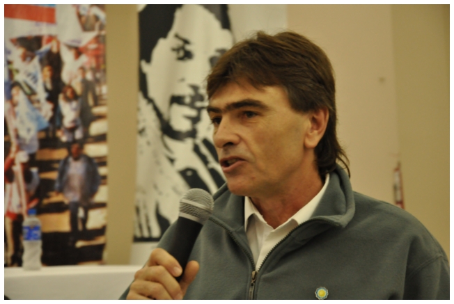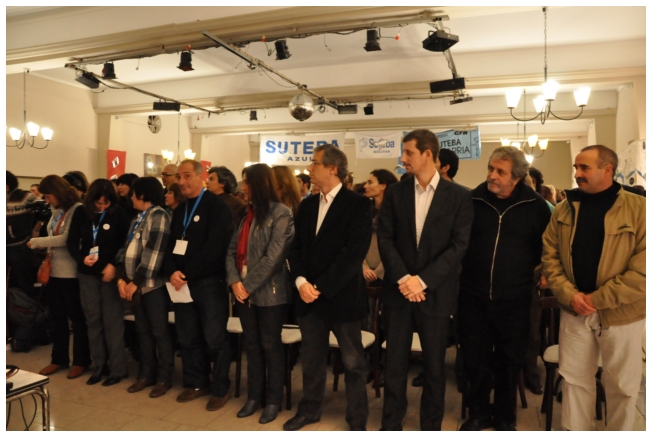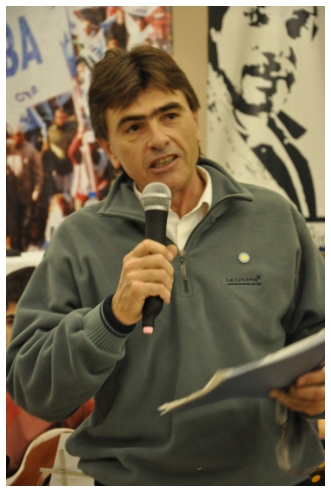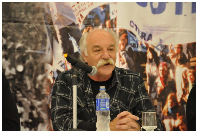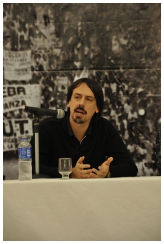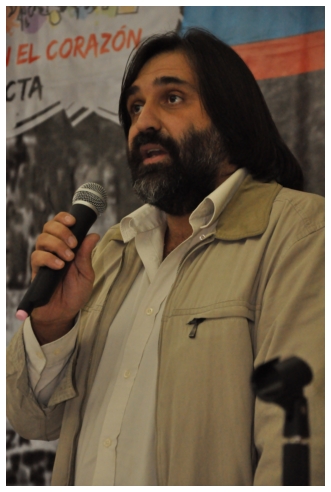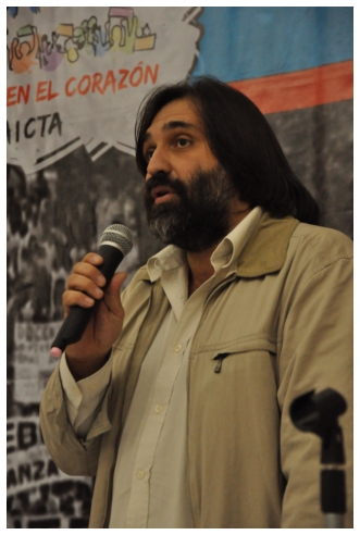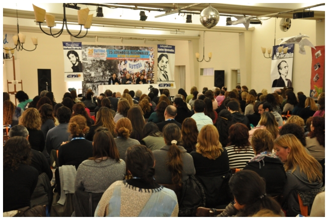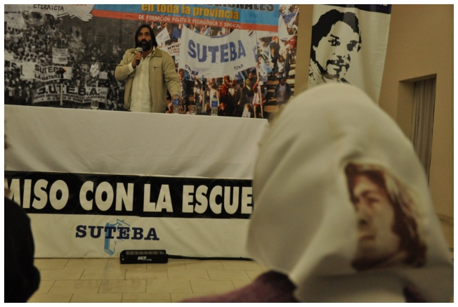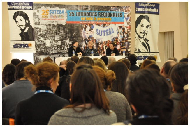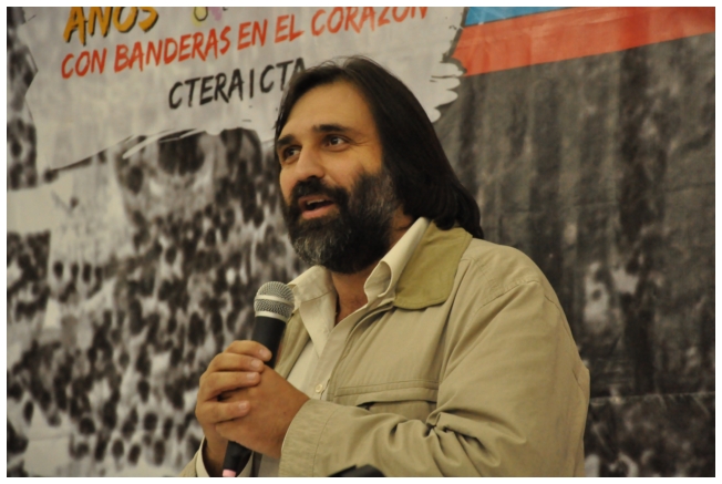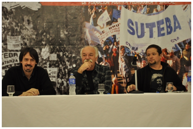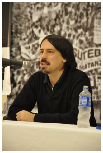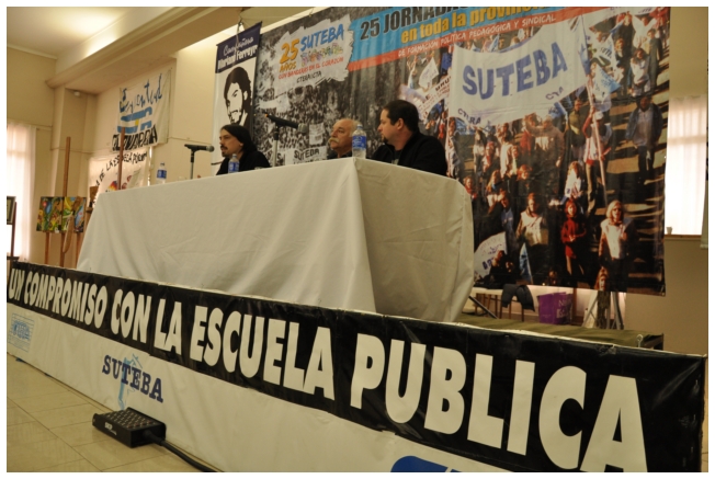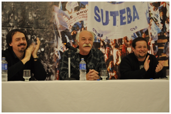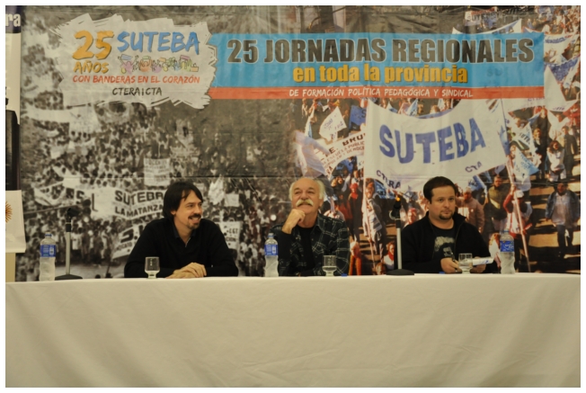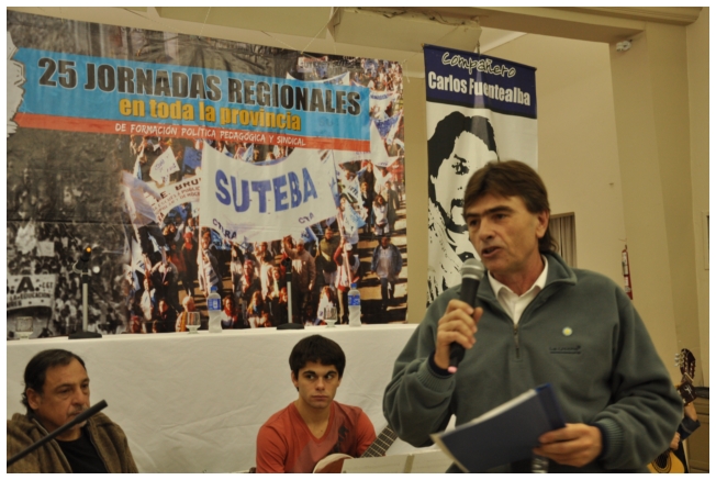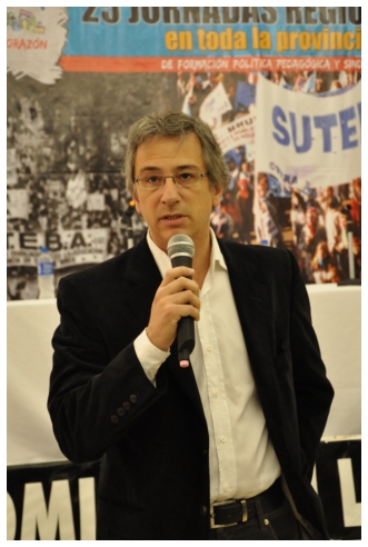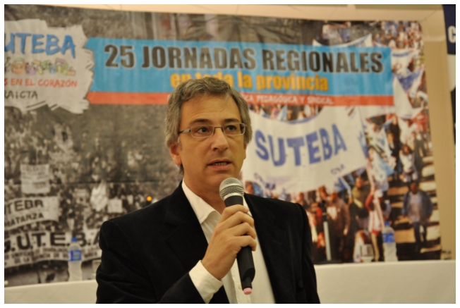 Comenzó haciendo una reflexión sobre los 25 años del SUTEBA dentro del contexto de los últimos 25 años en América Latina con respecto a la democratización de la política. Señaló que si la década del '80 se piensa como una década perdida, la del '90 es de la época neoliberal: “En los '90 se puso la regulación económica en manos de los grandes grupos económicos y se destruyeron los derechos de los trabajadores. Esta nueva época, es de disputa y discusión. Hay rumbos en tensión que empiezan a torcer la dirección de la historia, pero que no están realizados, están en disputa.” Siguió diciendo: “La fuerza que tuvo el neoliberalismo en los '90 fue también la fuerza que tuvo la crisis en el 2008. La fuerza con que atacó, fue la contrafuerza de la resistencia en Latinoamérica. Sin embargo, estos procesos en América Latina son muy distintos en todos los países, ya que el sub continente no es un conjunto homogéneo, por eso los sectores populares han avanzado de formas distintas. También los gobiernos son muy distintos entre ellos, algunos replantean otras formas de democracia directa, otros distintas formas de participación para desandar la forma colonial y poner en crisis esas estructuras al mismo tiempo que se discute la desigualdad y, en el campo de la inclusión, empezar a pensar como superar el capitalismo.” Destacó la nueva camada de presidentes y presidentas: “Indígenas, obreros, ex guerrilleros, mujeres, sacerdotes tercermunditas que expresan la capacidad de transformarse que tiene un sistema.” Luego, comparó la crisis del 2001 con el conflicto por la 125 en 2008, y dijo que “los niveles de discusión política que se dan en la sociedad, a diferencia del 2001, marcan una polarización entre dos bandos que empiezan a dibujar proyectos de país diferentes”. Y terminó diciendo: “Cuando uno ve como se expresa electoralmente en esta década es una experiencia muy diferente a los 90. Las tendencias de los 90 se han detenido, y se han empezado a revertir, y es en este contexto que con todas nuestras diferencias y nuestros puntos de acuerdo, tenemos que aprender a andar.”