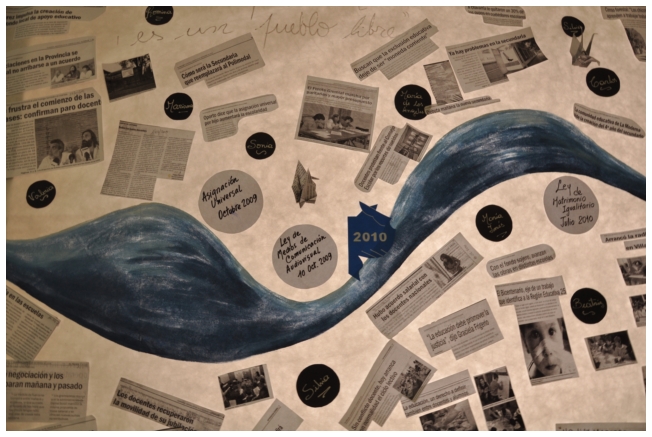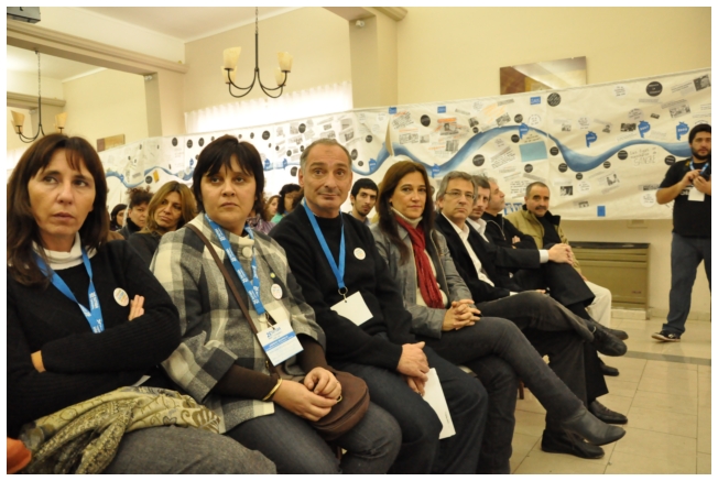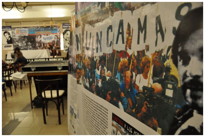Ingresando al salón estaban las mesas para las acreditaciones, y luego, a la izquierda una línea histórica del SUTEBA hecha por los docentes de Olavarria sobre una tela y a la derecha, los 12 banners que narran la historia de la organización sindical de los Docentes que se da como construcción el SUTEBA y que van de jornada en jornada.