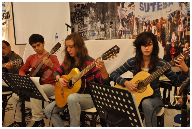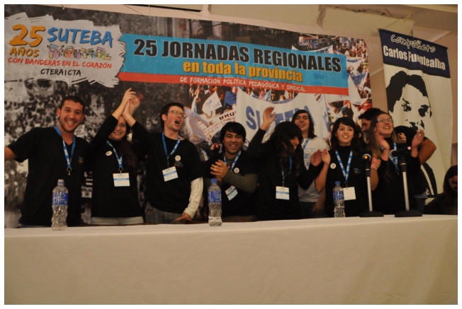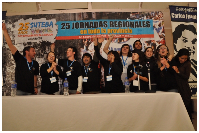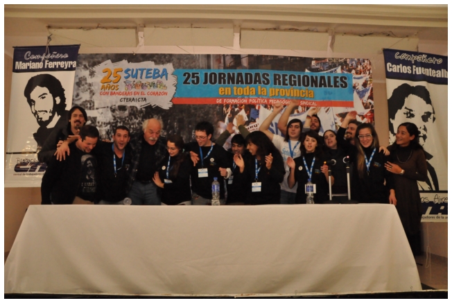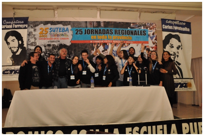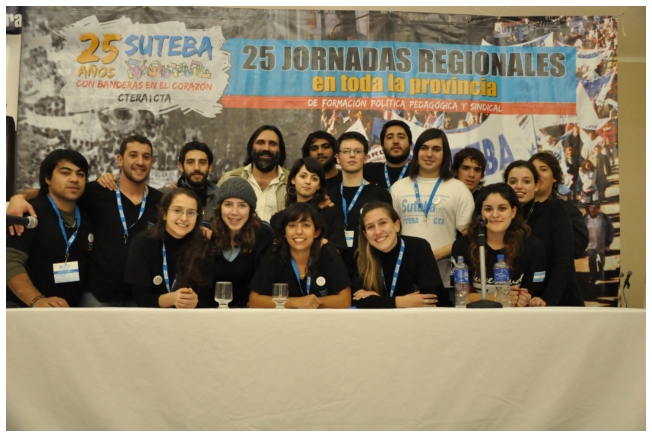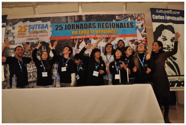 A las 12 terminó el panel luego del almuerzo, los docentes empezaron a trabajar en comisiones. Alrededor de las 16 horas, finalizó con gran entusiasmo la jornada con la actuación de la murga “Arrebatando Lágrimas” festejando los 25 del SUTEBA con Banderas en el Corazón.