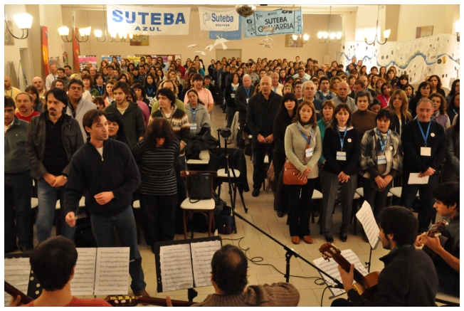 A continuación se pasó el video "SUTEBA 25 años". Por primera vez en las 25 jornadas, una vez finalizado el video los asistentes se pusieron a cantar “La educación del pueblo no se vende, se defiende”