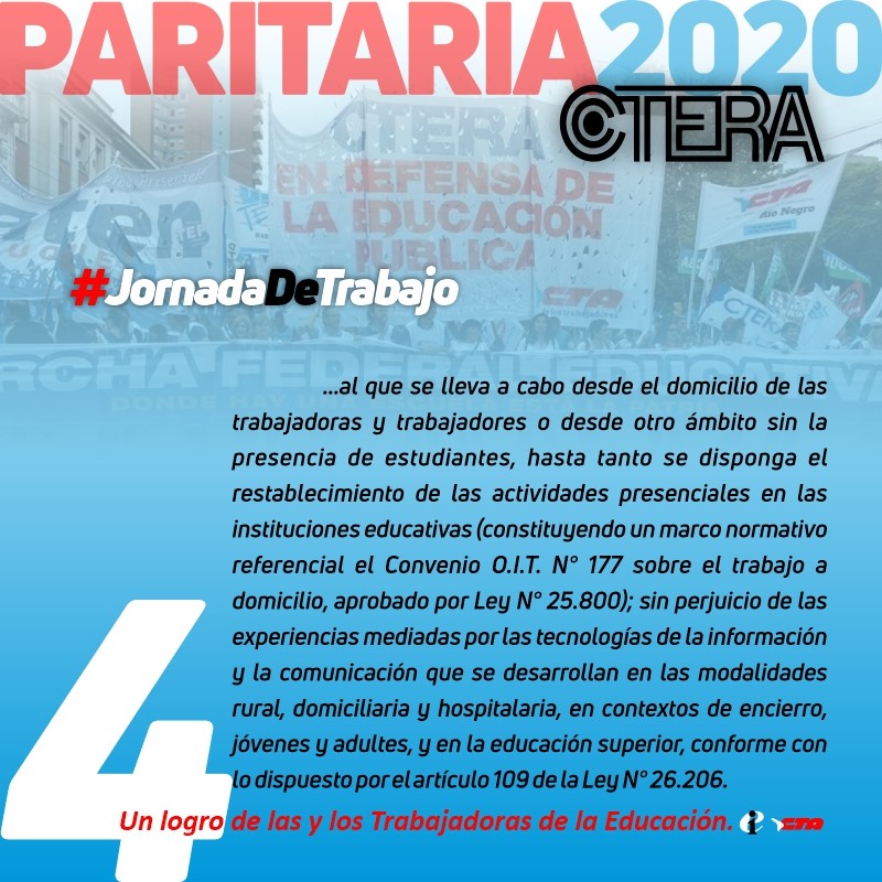 En dicha reunión, la Secretaria General de la CTERA, Sonia Alesso, enumeró los 12 puntos elaborados por nuestra Organización sobre Condiciones Laborales, entre otros puntos: condiciones de trabajo, infraestructura escolar; asimismo teletrabajo: Educación virtual en tiempos de Pandemia -respeto a la intimidad, la carga horaria, al descanso, a la desconexión-; planteó los temas referidos a licencias y salarios, derechos laborales y sindicales, cobertura de accidentes de trabajo y Formación Docente en Servicio.