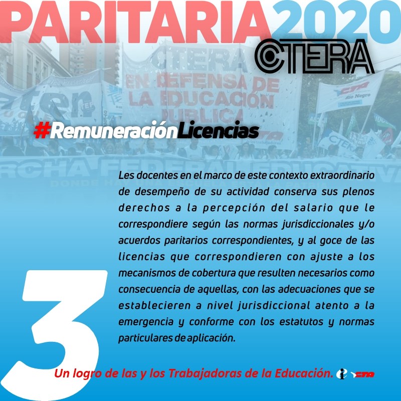 3. REMUNERACIÓN Y LICENCIAS. El/la Docente, en el marco de este contexto extraordinario de desempeño de su actividad, conserva sus plenos derechos a la percepción del salario que le correspondiere según las normas jurisdiccionales y/o Acuerdos Paritarios correspondientes, y al goce de las licencias que correspondieren con ajuste a los mecanismos de cobertura que resulten necesarios como consecuencia de aquellas, con las adecuaciones que se establecieren a nivel jurisdiccional atento a la emergencia y conforme con los estatutos y normas particulares de aplicación.