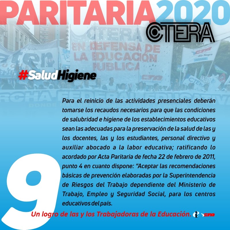 9. Para el reinicio de las actividades presenciales deberán tomarse los recaudos necesarios para que las condiciones de salubridad e higiene de los establecimientos educativos sean las adecuadas para la preservación de la salud de los/las Docentes, los/las Estudiantes, personal directivo y auxiliar abocado a la labor educativa; ratificando lo acordado por Acta Paritaria de fecha 22 de febrero de 2011, punto 4. en cuanto dispone: "Aceptar las recomendaciones básicas de prevención elaboradas por la Superintendencia de Riesgos del Trabajo dependiente del Ministerio de Trabajo, Empleo y Seguridad Social, para los centros educativos del país".