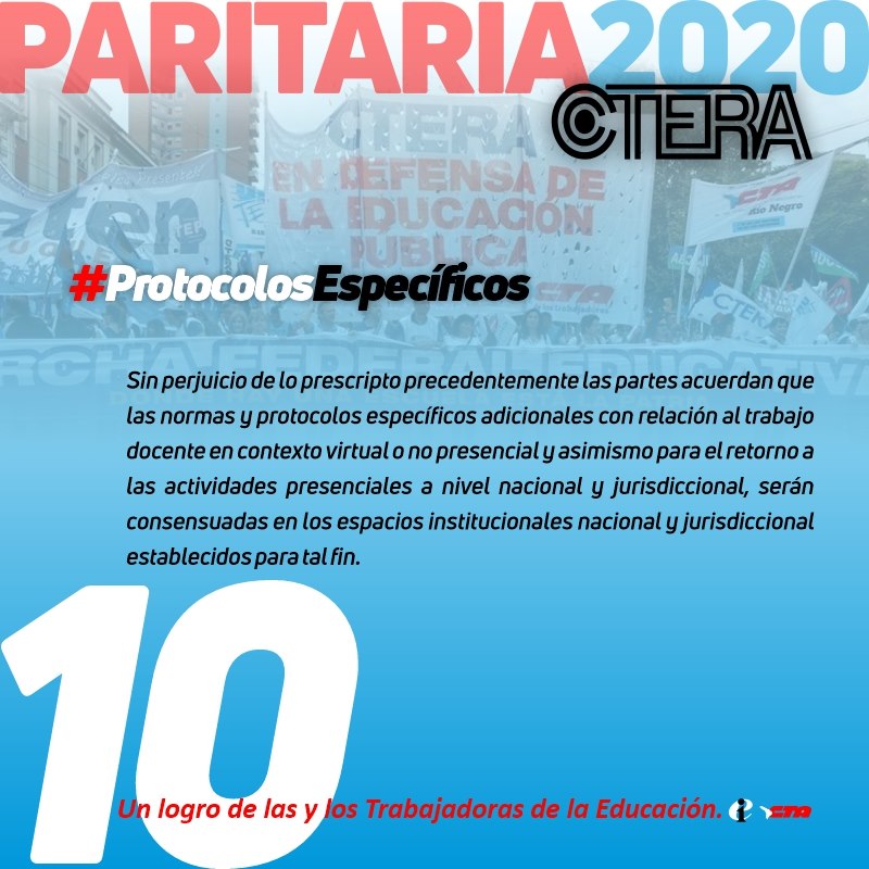 10. Sin perjuicio de lo prescripto precedentemente, las partes acuerdan que las normas y protocolos específicos adicionales con relación al trabajo docente en contexto virtual o no presencial y asimismo para el retorno a las actividades presenciales a nivel nacional y jurisdiccional, serán consensuadas en los espacios institucionales nacional y jurisdiccional establecidos para tal fin.