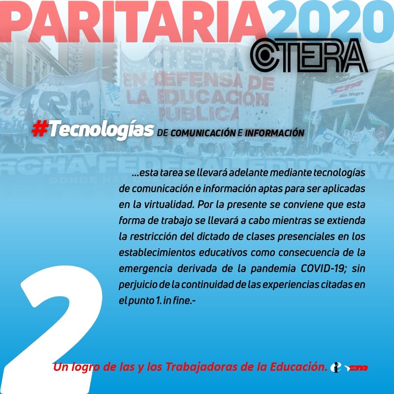2. En virtud de ello, esta tarea se llevará adelante mediante tecnologías de comunicación e información aptas para ser aplicadas en la virtualidad. Por la presente se conviene que esta forma de trabajo se llevará a cabo mientras se extienda la restricción del dictado de clases presenciales en los establecimientos educativos como consecuencia de la emergencia derivada de la pandemia COVID-19; sin perjuicio de la continuidad de las experiencias citadas en el punto 1. in fine.