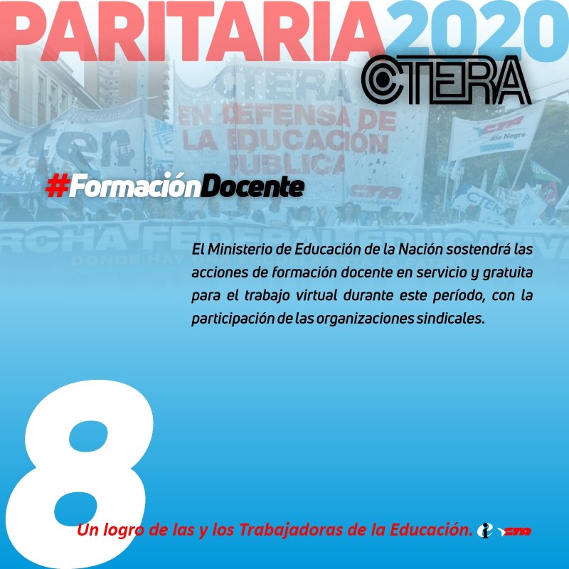 8. FORMACIÓN DOCENTE. El Ministerio de Educación de la Nación sostendrá las acciones de Formación Docente en servicio y gratuita para el trabajo virtual durante este período, con la participación de las Organizaciones Sindicales.