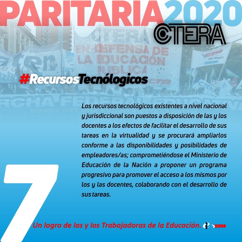 7. RECURSOS TECNOLÓGICOS. Los recursos tecnológicos existentes a nivel nacional y jurisdiccional son puestos a disposición de los/las Docentes a los efectos de facilitar el desarrollo de sus tareas en la virtualidad y se procurará ampliarlos conforme a las disponibilidades y posibilidades de los/las empleadores/as; comprometiéndose el Ministerio de Educación de la Nación a proponer un programa progresivo para promover el acceso a los mismos por los/las Docentes, colaborando con el desarrollo de sus tareas.