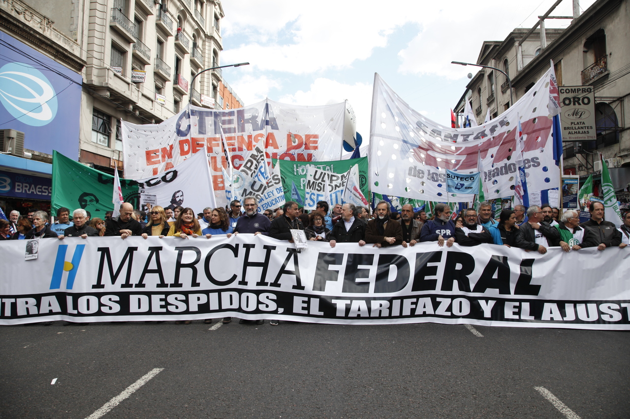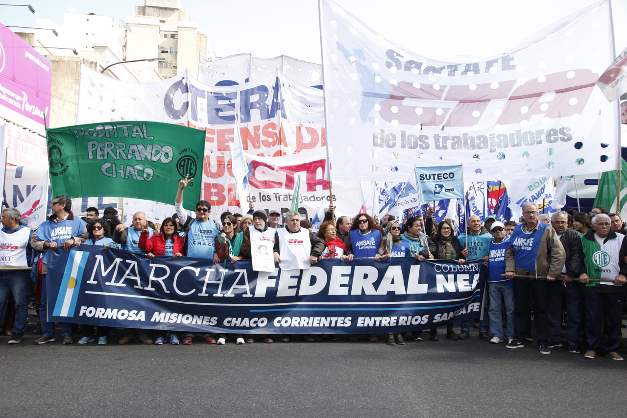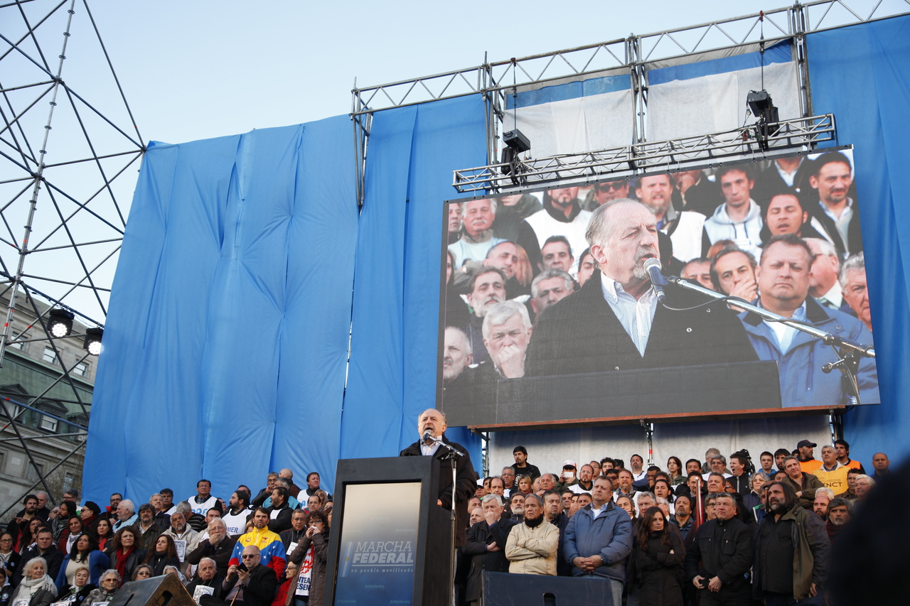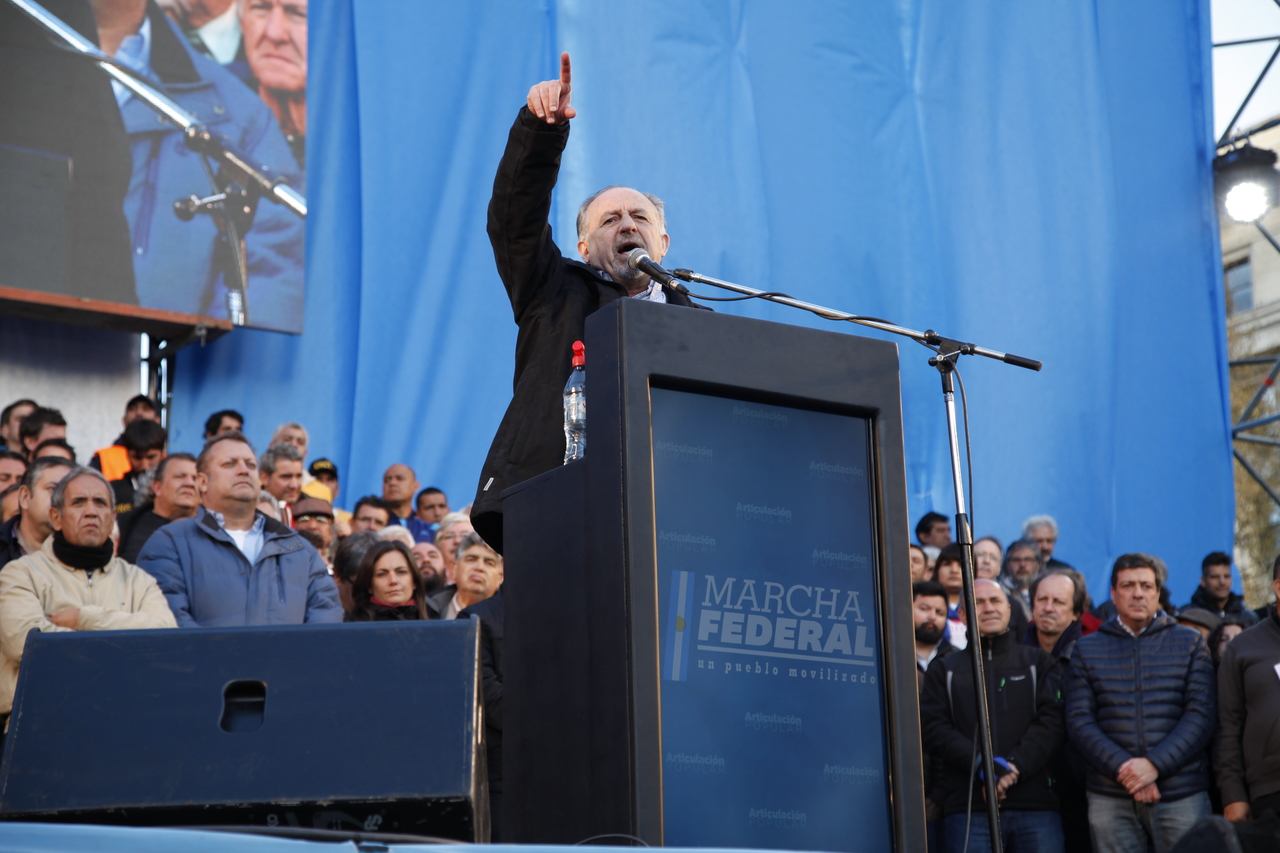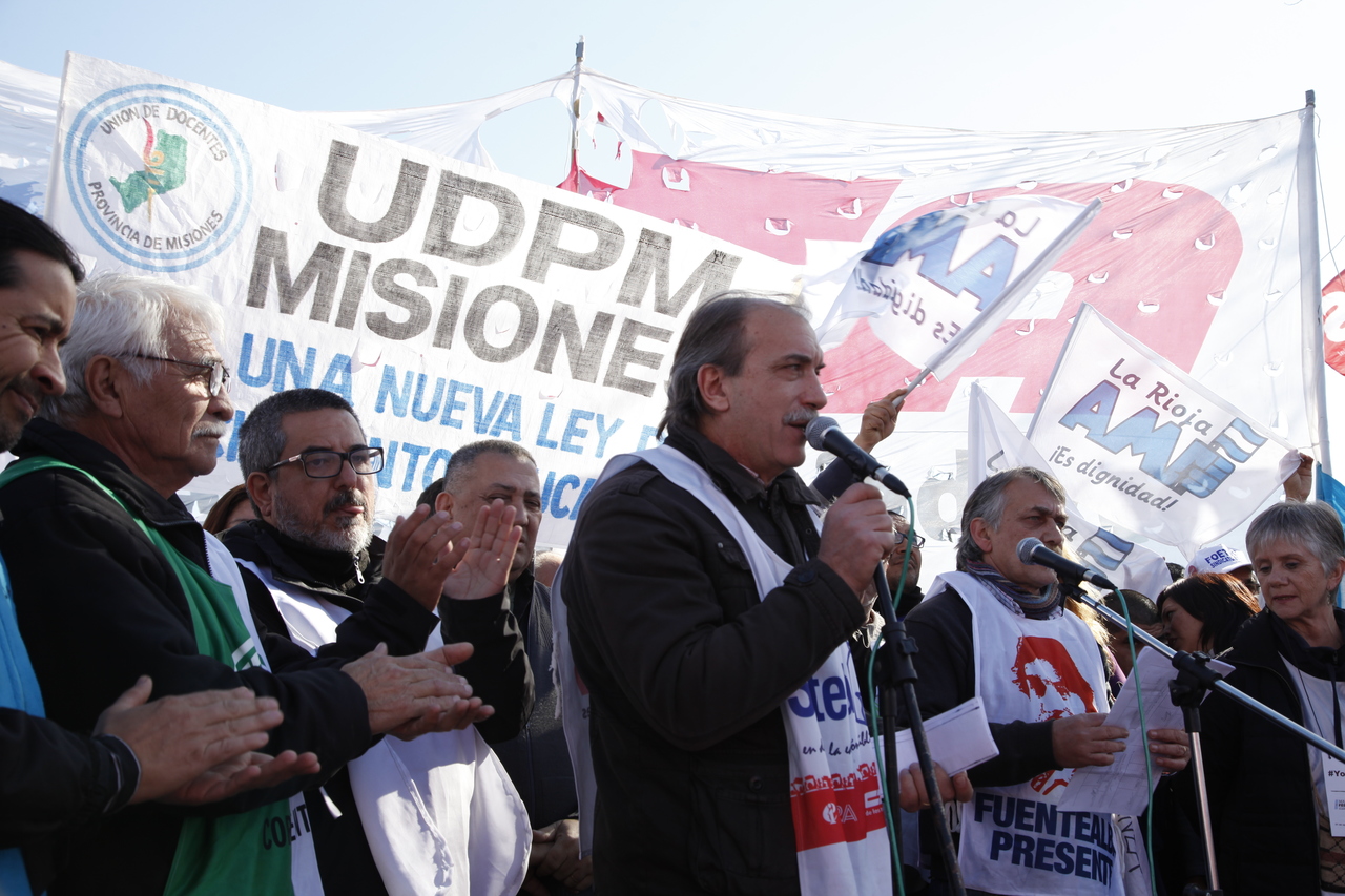 A su vez, Yasky remarcó las exigencias de la Marcha Federal: "Reclamamos apertura de paritarias con los docentes que dieron el ejemplo con un masivo paro, aumento de emergencia para jubilados, le exigimos al Gobierno que se declare la emergencia social en el país para proteger el empleo y las pymes y reactivar el mercado interno. No queremos que nos sigan imponiendo planes de ajuste y no queremos ir a un escenario de reformas laborales, como tampoco la entrega de la Nación que se pretende hacer a espaldas del pueblo".