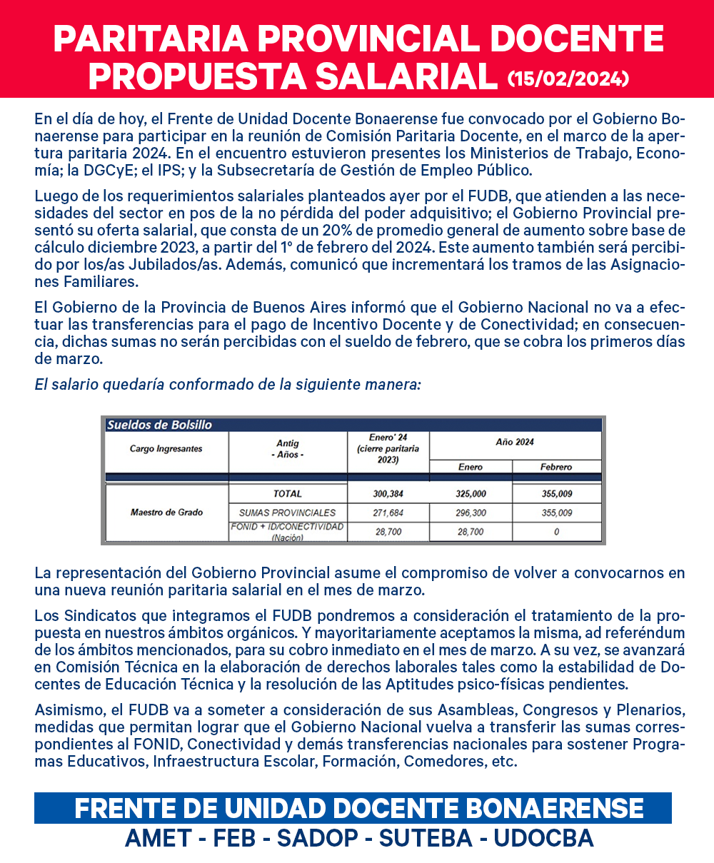 Los Sindicatos que integramos el FUDB pondremos a consideración el tratamiento de la propuesta en nuestros ámbitos orgánicos. Y mayoritariamente aceptamos la misma, ad referéndum de los ámbitos mencionados, para su cobro inmediato en el mes de marzo. A su vez, se avanzará en Comisión Técnica en la elaboración de derechos laborales tales como la estabilidad de Docentes de Educación Técnica y la resolución de las Aptitudes psico-físicas pendientes.