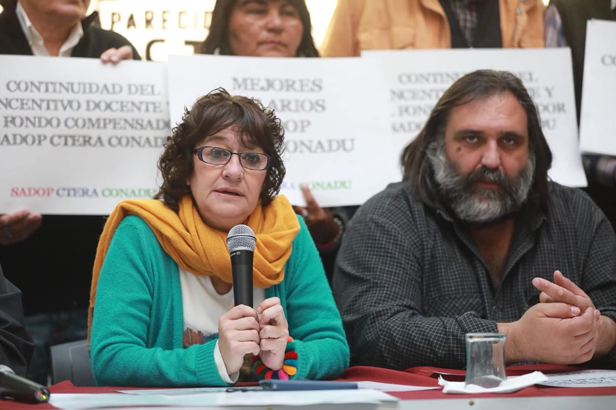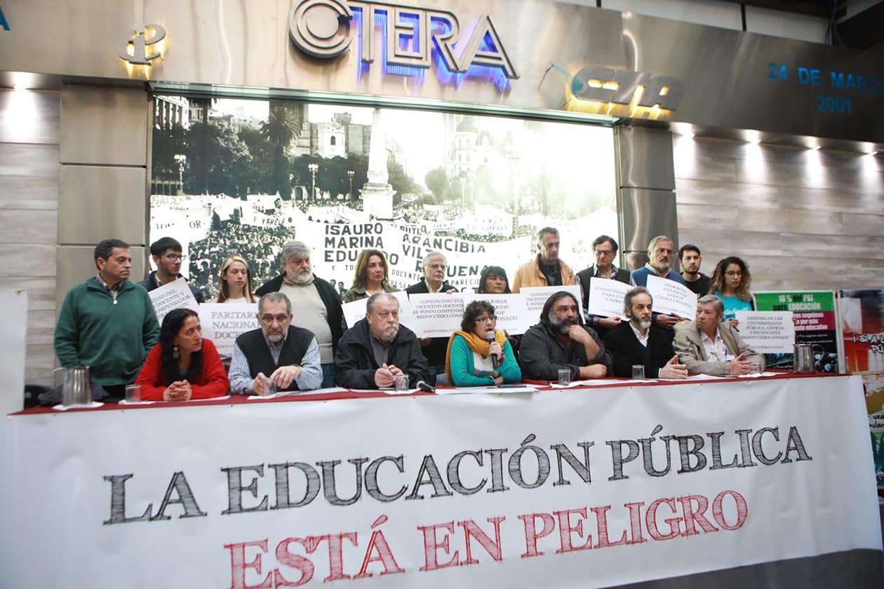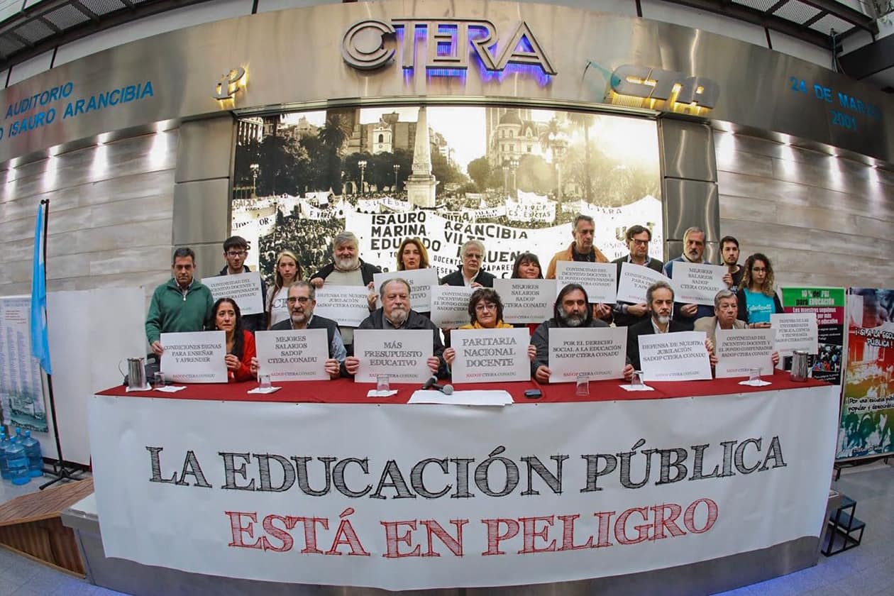 La conferencia de prensa estuvo encabezada por Sonia Alesso, Secretaria General de CTERA; Roberto Baradel, Secretario General Adjunto de CTERA; Eduardo López, Secretario Gremial de CTERA; Pedro Bayugar y Gerardo Alzamora por SADOP, y Carlos De Feo y Yamile Socolovsky por CONADU.