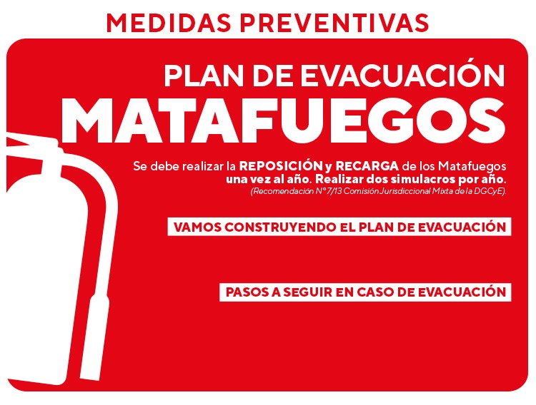 Esta aficheta que compartimos desde la Secretaría de Salud Laboral del SUTEBA brinda información importante sobre las pautas y procedimientos de prevención referidas a las medidas preventivas contempladas en el Plan de Evacuación y Mantenimiento de los Matafuegos.