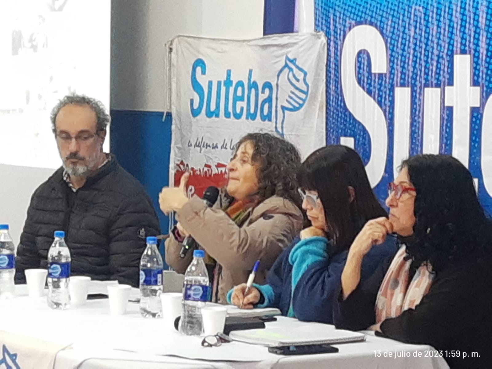 Luego de las palabras de bienvenida del Secretario de DDHH del SUTEBA distrital, Gustavo Dueñas, se dio comienzo al panel con la apertura de Patricia Romero Díaz y Analía Meaurio, Secretaria y Subsecretaria de DDHH del SUTEBA Provincia, quienes plantearon los objetivos del seminario, vinculando la trayectoria histórica de nuestra Organización Sindical en la construcción y transmisión de la Memoria, abrazando desde su constitución la lucha por los DDHH y remarcando su relevancia frente a nuestra actualidad social y política, en la cual emergen discursos negacionistas y hechos violentos de profunda gravedad institucional como los que ocurren en la provincia de Jujuy, donde la intervención de las fuerzas de seguridad locales, con anuencia del Gobernador provincial, despliegan prácticas similares a las del terrorismo de Estado del ‘76. Violencia estatal que, como sociedad, no debemos tolerar y que repudiamos enérgicamente.