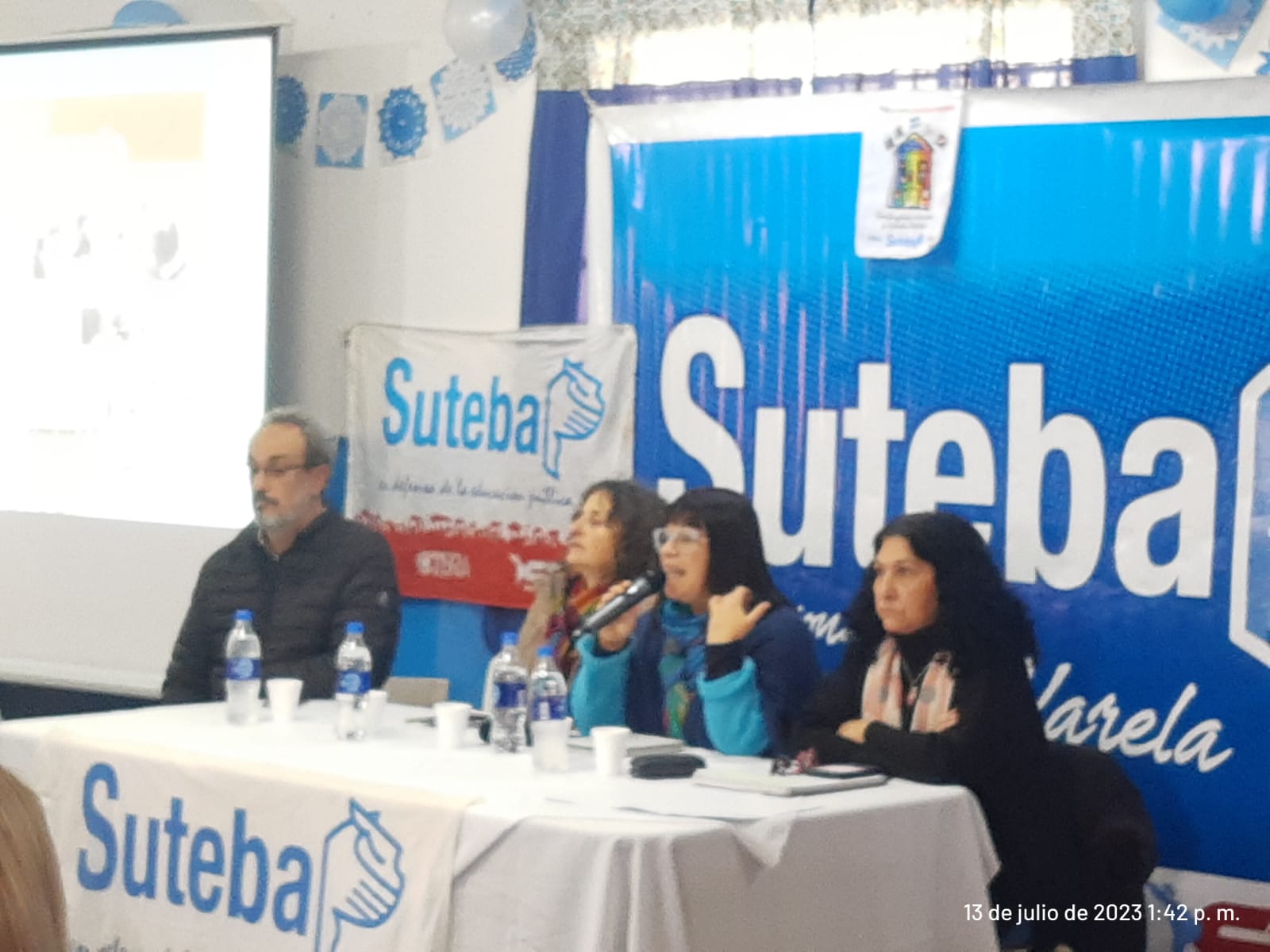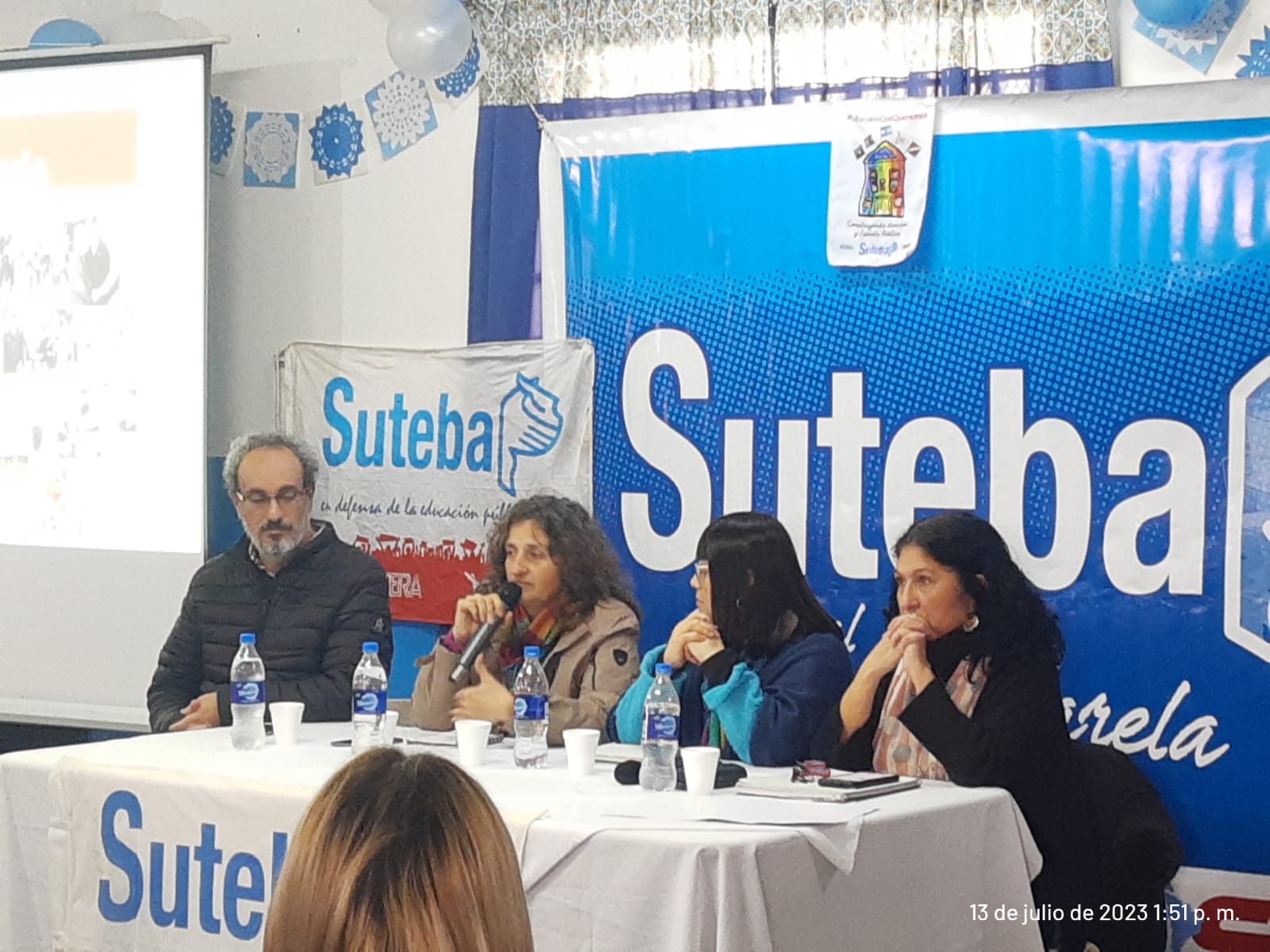 Luego de las palabras de bienvenida del Secretario de DDHH del SUTEBA distrital, Gustavo Dueñas, se dio comienzo al panel con la apertura de Patricia Romero Díaz y Analía Meaurio, Secretaria y Subsecretaria de DDHH del SUTEBA Provincia, quienes plantearon los objetivos del seminario, vinculando la trayectoria histórica de nuestra Organización Sindical en la construcción y transmisión de la Memoria, abrazando desde su constitución la lucha por los DDHH y remarcando su relevancia frente a nuestra actualidad social y política, en la cual emergen discursos negacionistas y hechos violentos de profunda gravedad institucional como los que ocurren en la provincia de Jujuy, donde la intervención de las fuerzas de seguridad locales, con anuencia del Gobernador provincial, despliegan prácticas similares a las del terrorismo de Estado del ‘76. Violencia estatal que, como sociedad, no debemos tolerar y que repudiamos enérgicamente.