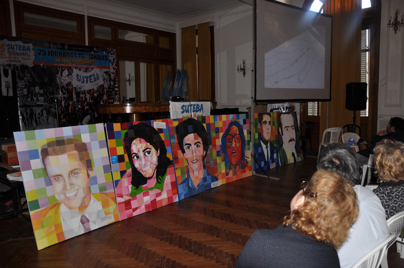 Al final del día, pasaron al frente familiares de los siete desaparecidos oriundos de Pehuajó, para que los docentes junto con sus alumnos de primaria le hicieran entrega a cada familiar del retrato que habían hecho de cada desaparecido.