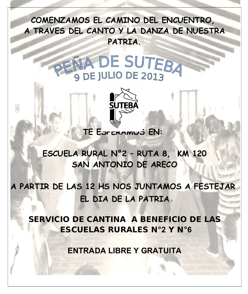 Vuelven las peñas del SUTEBA y la primera será en San Antonio de Areco el 9 de julio, en la Escuela Rural EP Nº2 (Ruta 8 - km 120) y será a beneficio de esa escuela y de la Escuela Rural Nº6.Además, la cantina será a beneficio de esas dos instituciones. Afuera se realizarán juegos tradicionales. El horario será de 12 a 17 hs y la entrada es libre y gratuita.