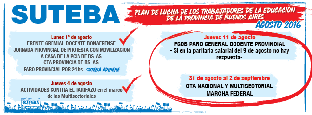 A su vez ante la ratificación de la justicia del aumento de las tarifas nos manifestaremos el próximo 4 de agosto en todas las plazas de la provincia de Bs. As, y dando continuidad a las acciones en defensa de nuestros derechos y contra las políticas neoliberales, que tanto mal han hecho a nuestro país, la CTA Provincia de Buenos Aires como parte convocante participará de la Marcha Federal con la Multisectorial del 31 de agosto al 2 de septiembre por una vida más digna.