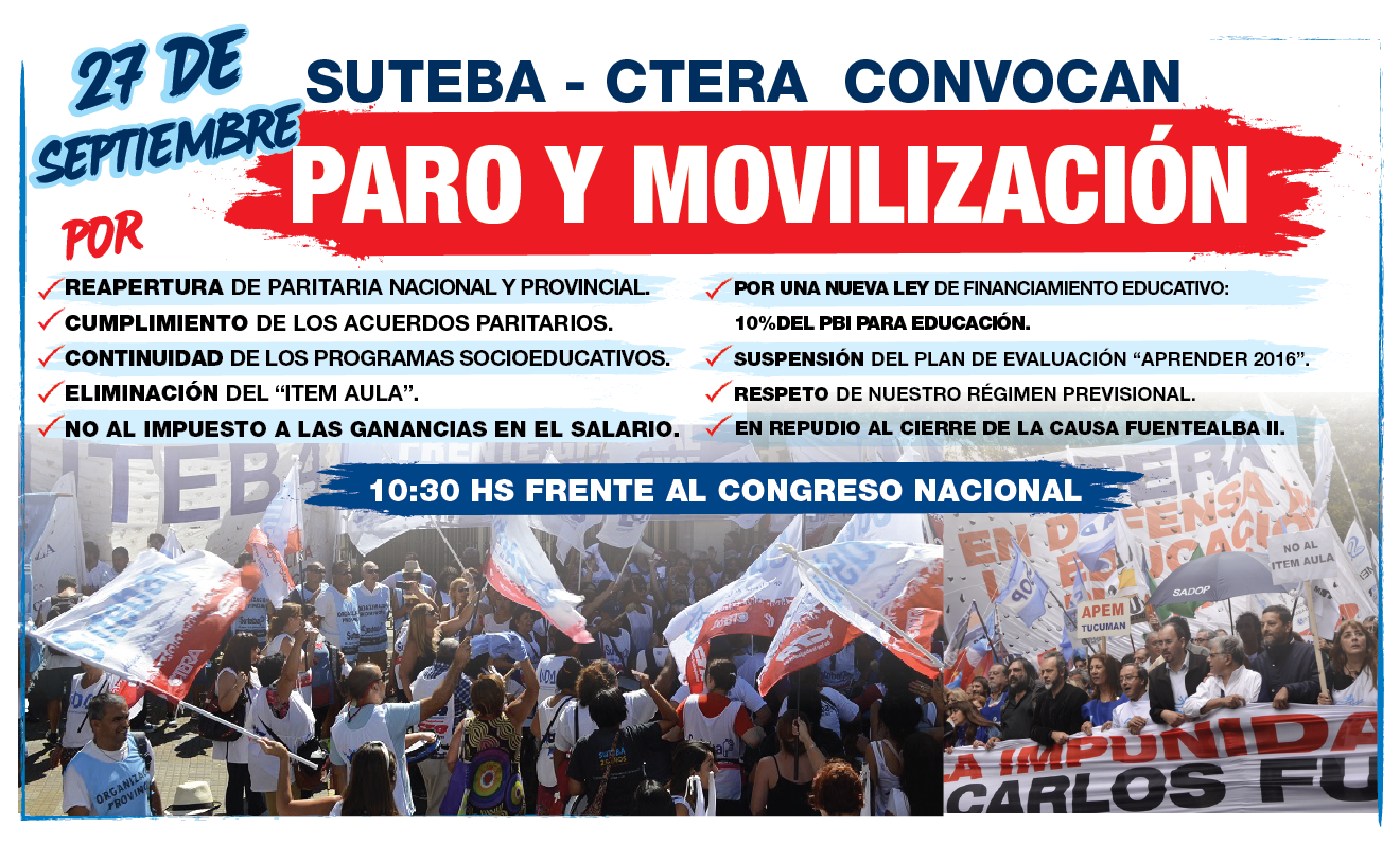 Ante la grave situación que tiene a varias provincias en conflictos y la negativa del gobierno nacional y los gobiernos provinciales de reabrir las paritarias; y la amenaza a nuestro régimen previsional docente, la Junta Ejecutiva de CTERA y el Plenario de Secretarios Generales resolvió Paro Nacional Docente el 27 de septiembre con concentración frente al Congreso de la Nación y movilización al Ministerio de Educación de la Nación.