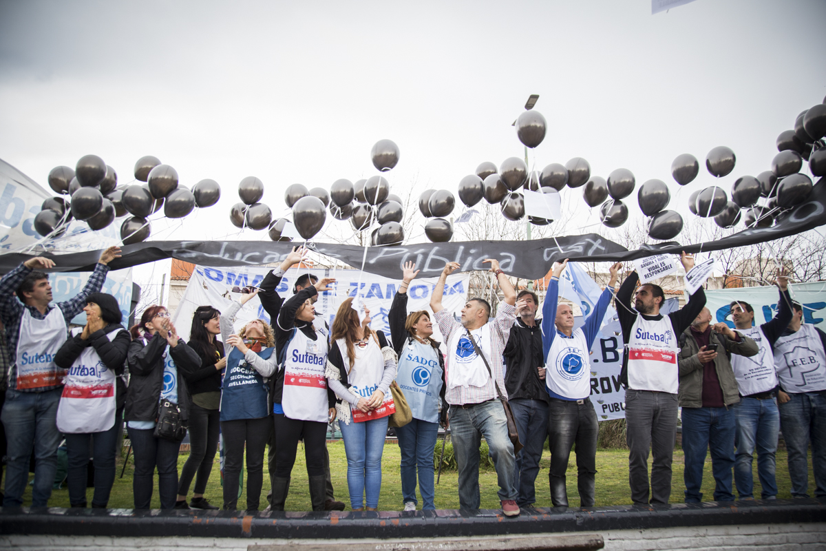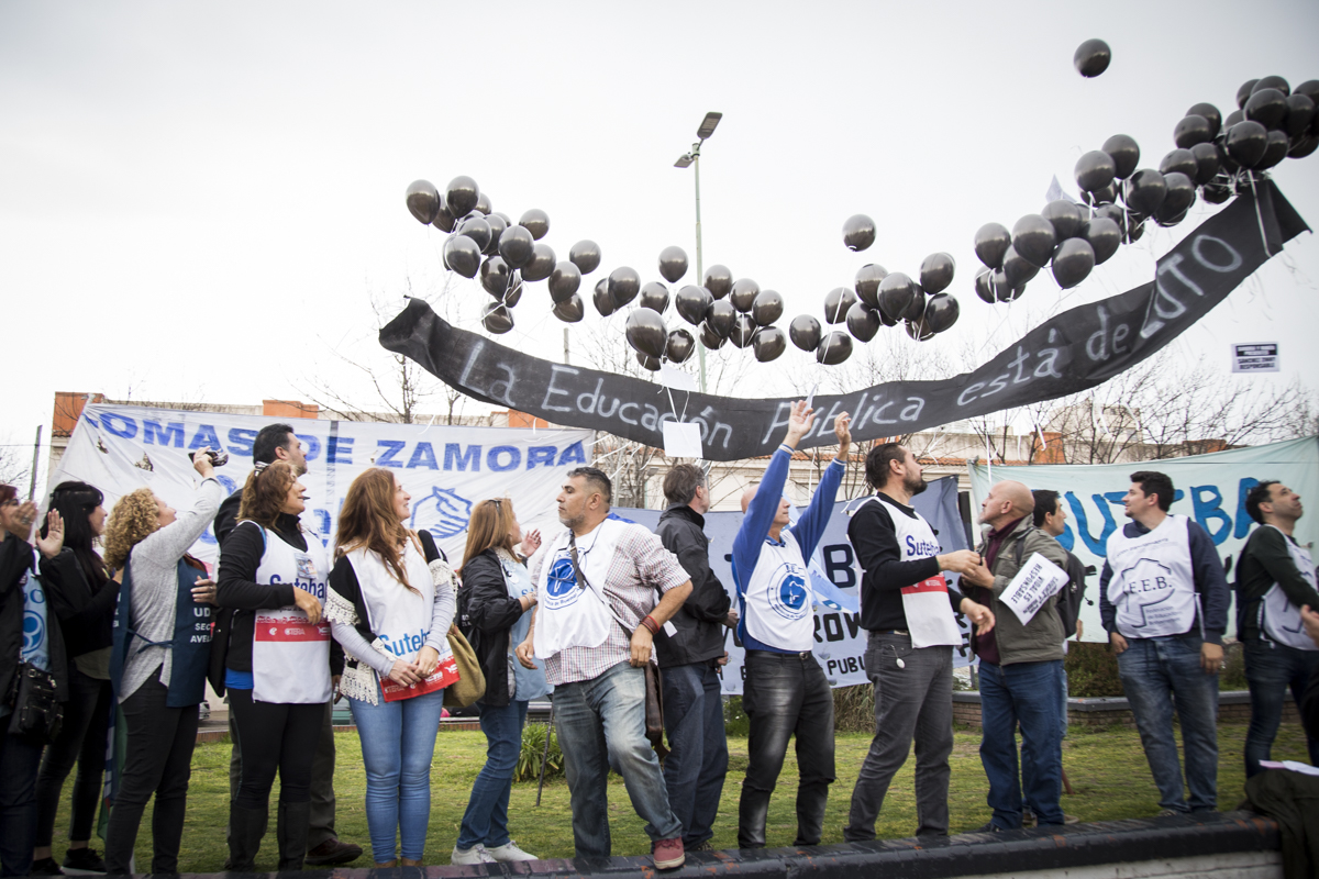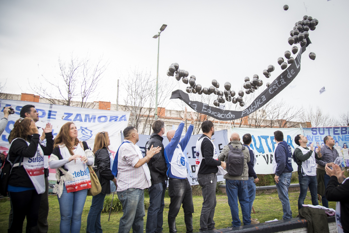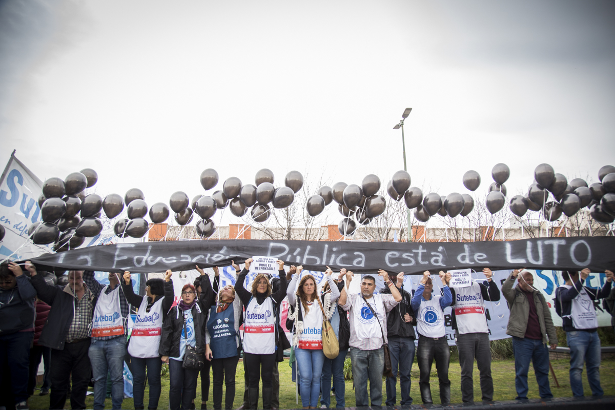 Luego del comienzo en el que se entonaron las estrofas del Himno Nacional, se realizó un minuto de aplausos y campanazos en memoria de Sandra y Rubén. Asimismo, lxs presentes participaron de una suelta de globos negros que portaban la pancarta "La Educación Pública está de luto", en recordatorio del 2 de agosto lamentable en que nuestrxs compañerxs perdieron la vida y para denunciar la desidia y el ajuste que impone el Gobierno Provincial en la Educación bonaerense.