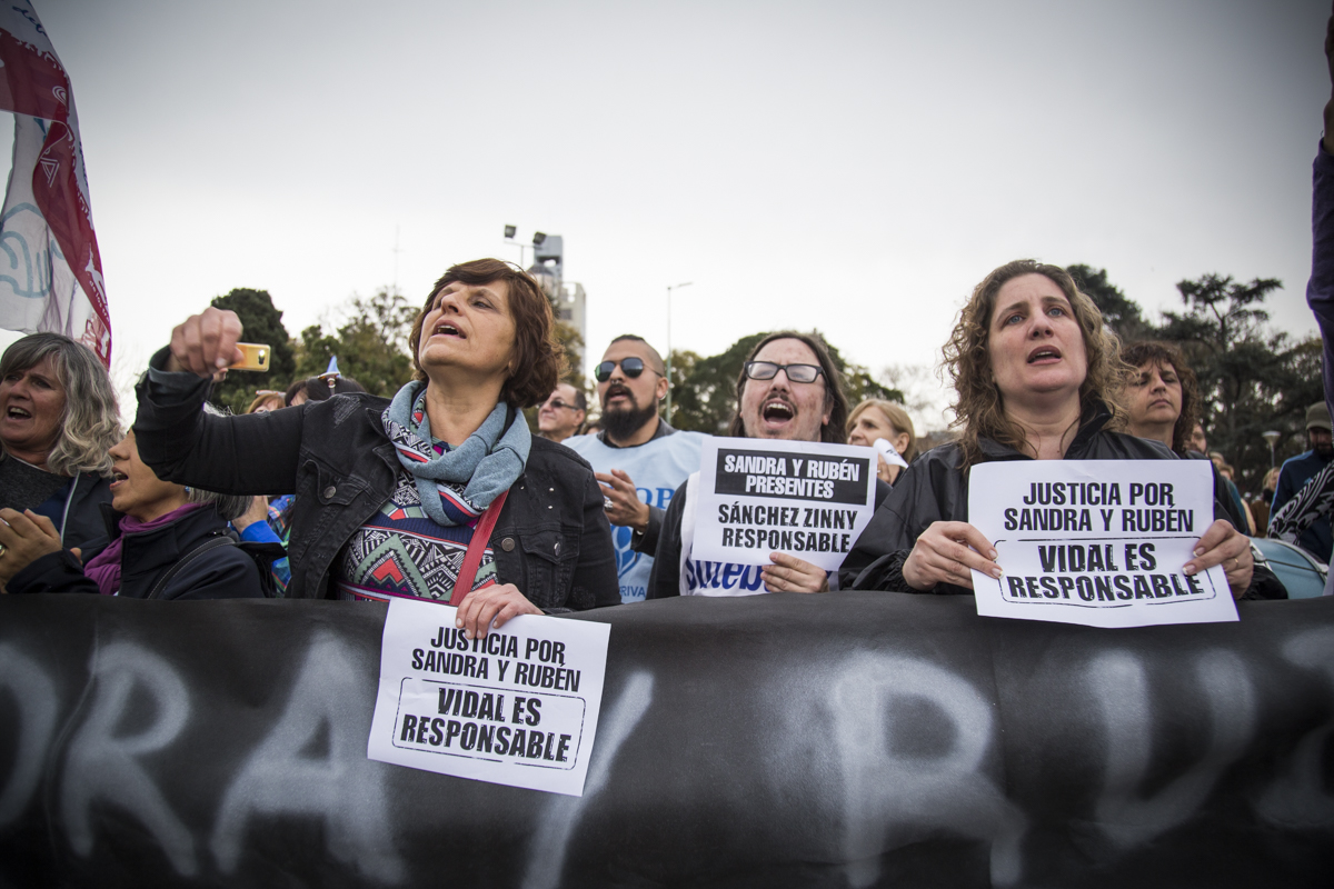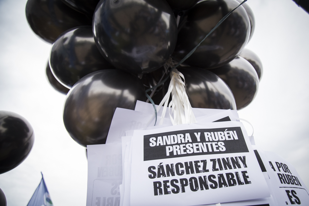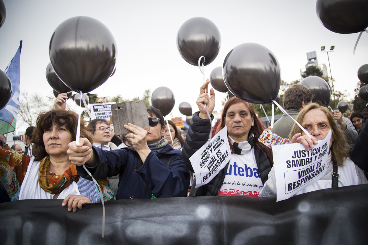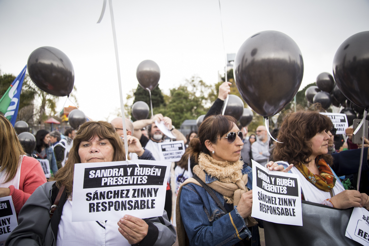Luego del comienzo en el que se entonaron las estrofas del Himno Nacional, se realizó un minuto de aplausos y campanazos en memoria de Sandra y Rubén. Asimismo, lxs presentes participaron de una suelta de globos negros que portaban la pancarta "La Educación Pública está de luto", en recordatorio del 2 de agosto lamentable en que nuestrxs compañerxs perdieron la vida y para denunciar la desidia y el ajuste que impone el Gobierno Provincial en la Educación bonaerense.