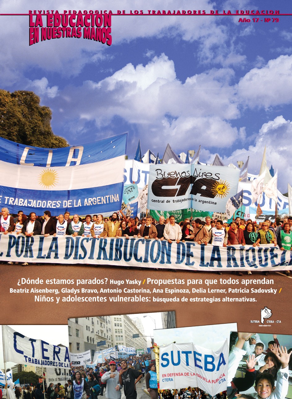LA EDUCACION EN NUESTRAS MANOS, es una publicación propiedad de SUTEBA, Sindicato Unificado de Trabajadores de la Educación de la Provincia de Buenos Aires. Redacción y Administración: Piedras 740, Tel. 4361-6647. Código Postal 1070, Buenos Aires, República Argentina. Registro de la Propiedad Intelectual Nº 903341. Revista declarada de Interés Legislativo por la Honorable Cámara de Diputados de la Pcia. de Buenos Aires.