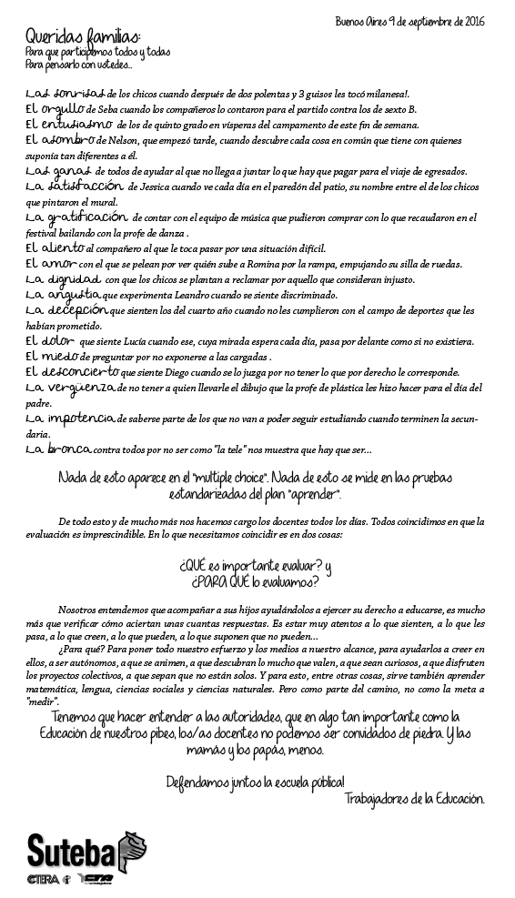 ¿Para qué? Para poner todo nuestro esfuerzo y los medios a nuestro alcance, para ayudarlos a creer en ellos, a ser autónomos, a que se animen, a que descubran lo mucho que valen, a que sean curiosos, a que disfruten los proyectos colectivos, a que sepan que no están solos. Y para esto, entre otras cosas, sirve también aprender matemática, lengua, ciencias sociales y ciencias naturales. Pero como parte del camino, no como la meta a "medir".