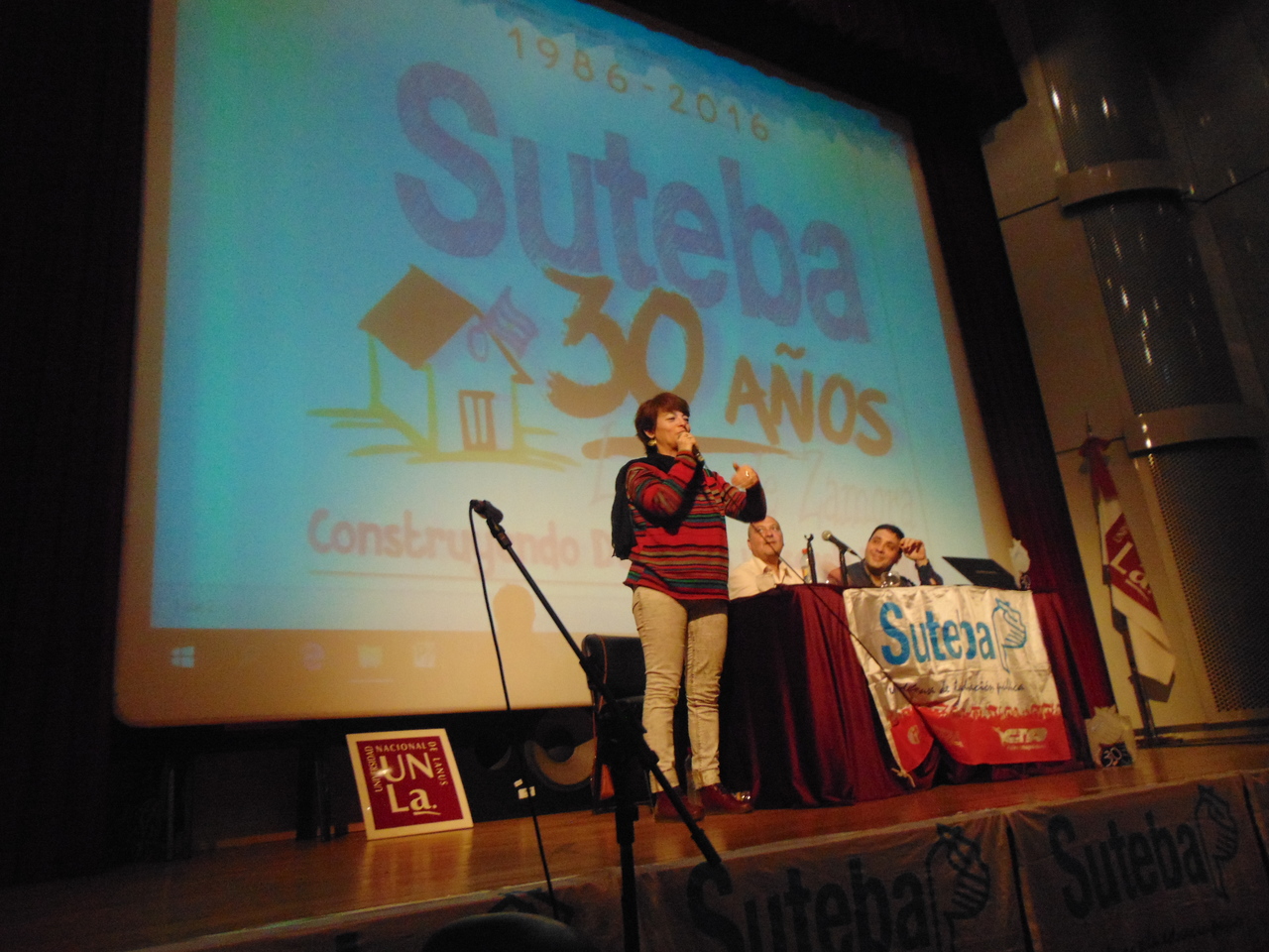 El martes 13, el SUTEBA Lomas de Zamora organizó una jornada pedagógica en el Cine "Tita Merello" de la Universidad Nacional de Lanús. Este encuentro contó con la presencia de más de 200 compañeros, de todos los niveles y modalidades, quienes celebraron los 30 años del SUTEBA y debatieron sobre el programa "Aprender 2016".