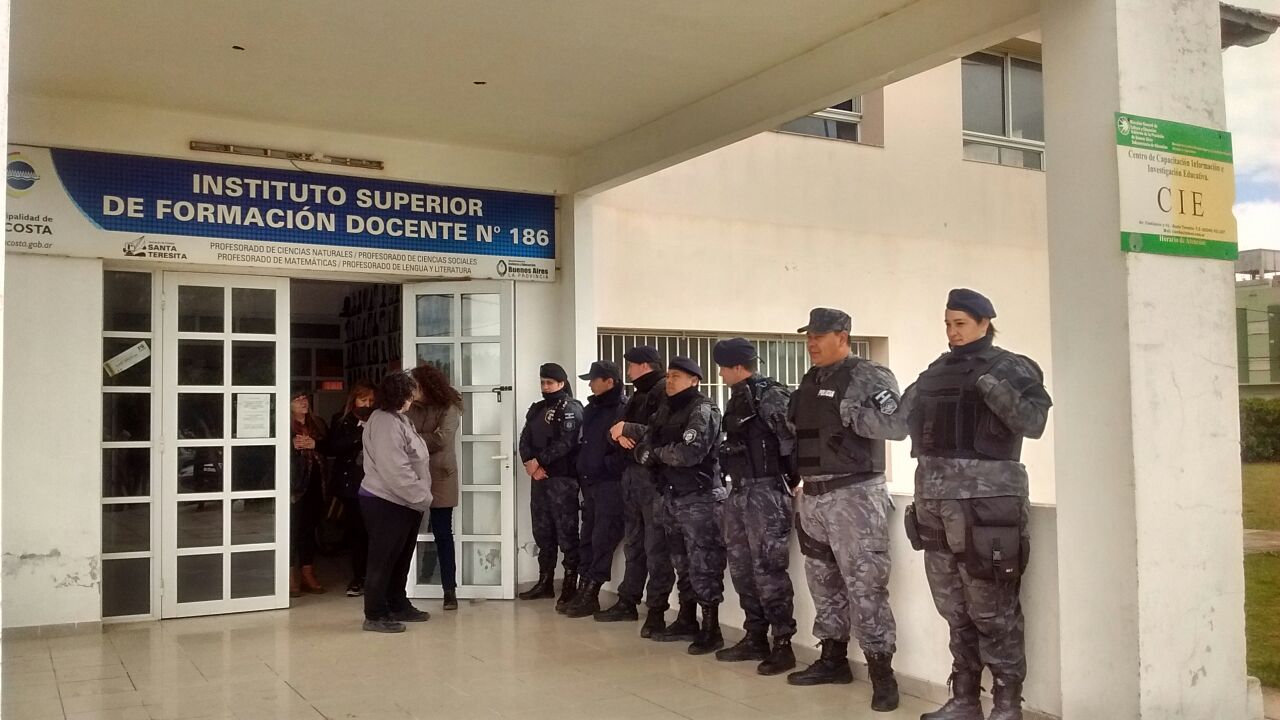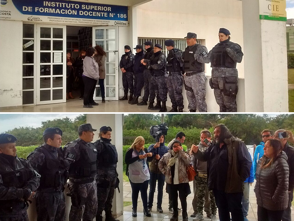 SUTEBA denuncia, que en una clara actitud intimidatoria y sin precedentes desde la recuperación de la Democracia, un grupo importante de agentes de la Policía Bonaerense se apostaron en la puerta de una Escuela, donde se está realizando una reunión de delegados con la presencia del Secretario General del SUTEBA, Roberto Baradel.