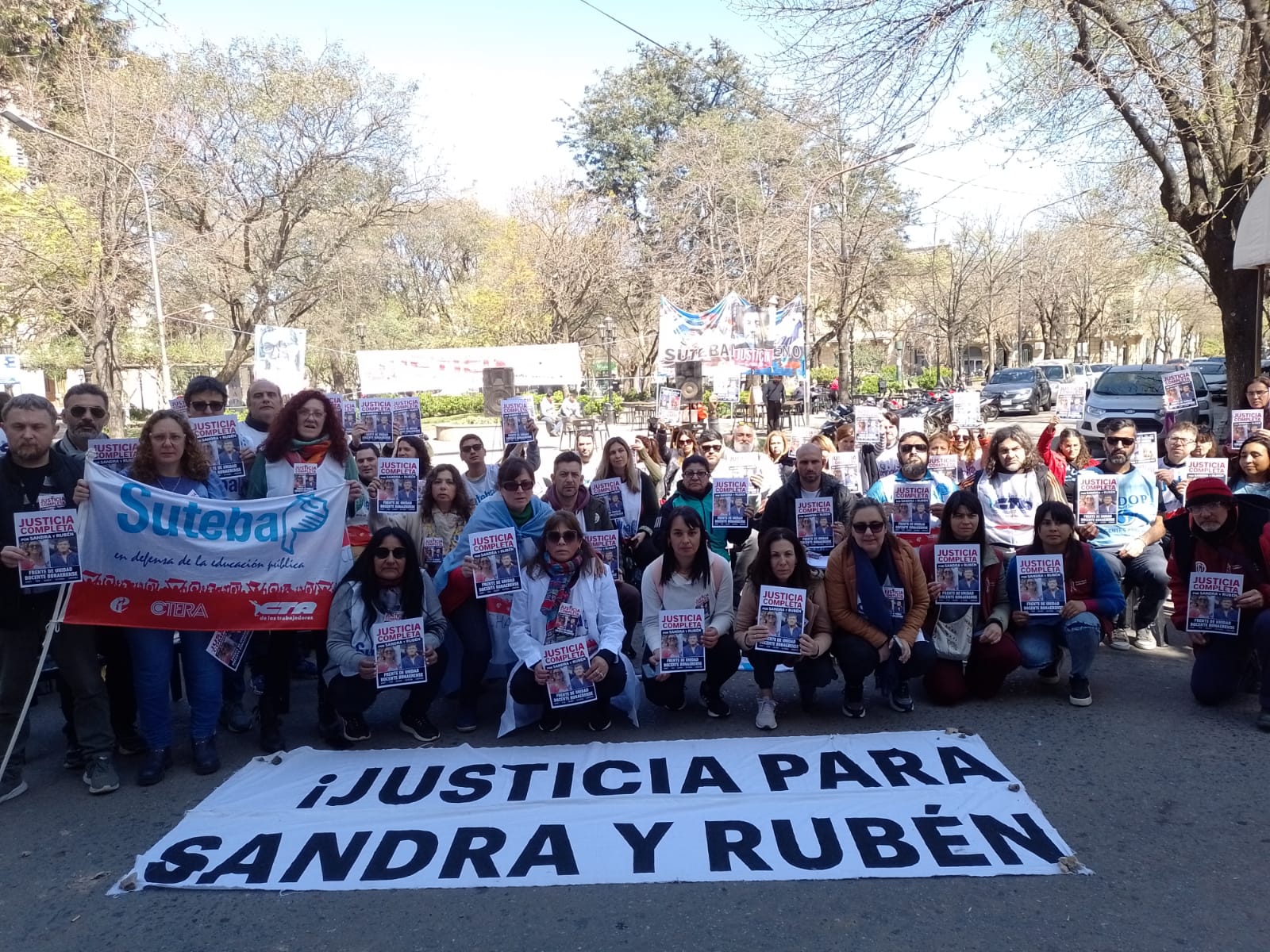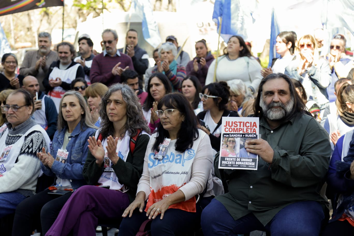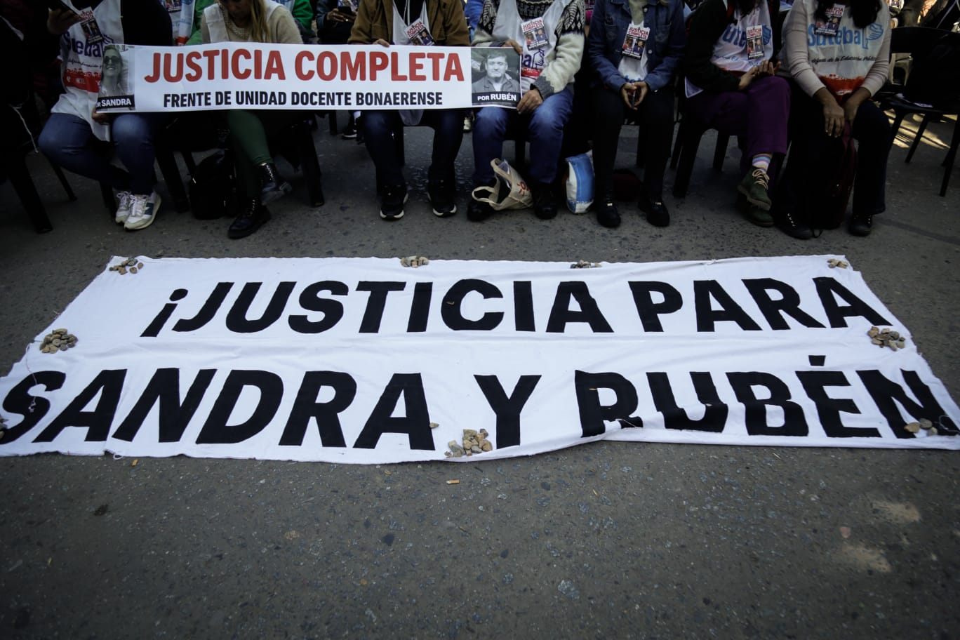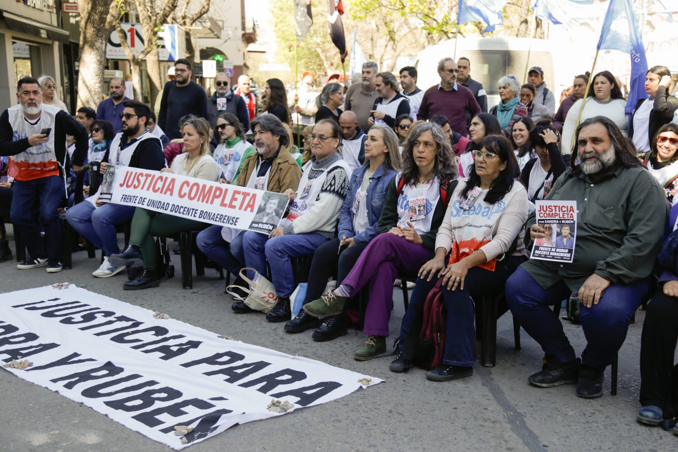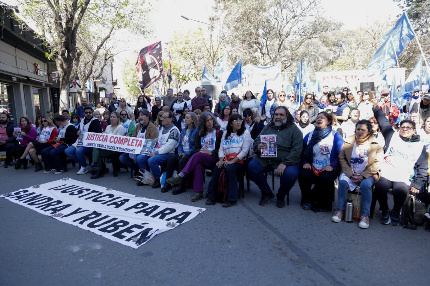 Roberto Baradel, Secretario General del SUTEBA, expresó: "Estamos presentes para escuchar los alegatos, acompañar a las familias y que se haga justicia para Sandra y Rubén, además de esperar que la Justicia tome la decisión de avanzar esta causa contra lxs responsables institucionales de ese momento. Queremos que haya Justicia Completa".