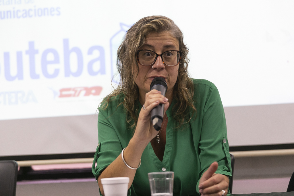 A continuación, Larisa Kejval, Directora de la Carrera de Ciencias de la Comunicación de la UBA, comenzó su presentación con la proyección del segundo capítulo de la serie "De plazas y pantallas".