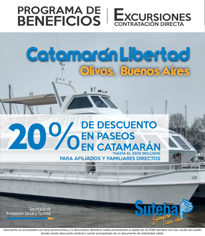 IMPORTANTE: Es un beneficio con CONTRATACIÓN DIRECTA. Esto significa que hay que comunicarse personalmente para conocer las tarifas y hacer reservas. No es necesario acercarse a la Seccional. Todxs lxs afiliadxs tienen un 20% de descuento sobre la tarifa indicada desde el catamarán. Para acceder al beneficio, se puede presentar el COULI o la Tarjeta de Beneficios "SUTEBA Siempre con vos".