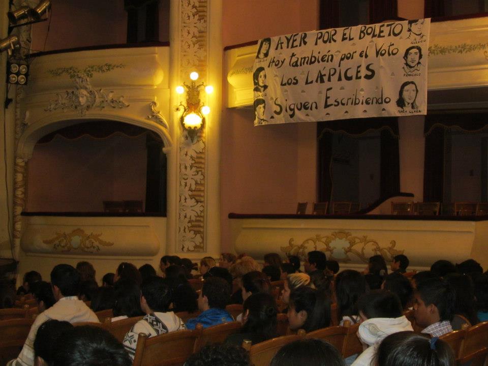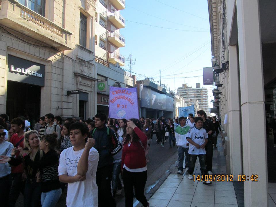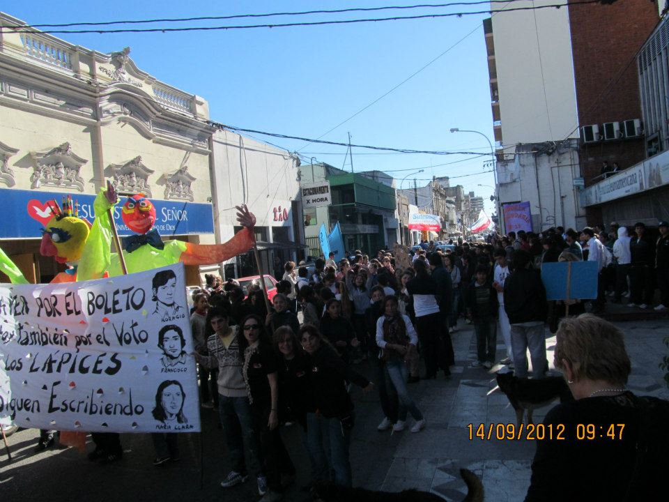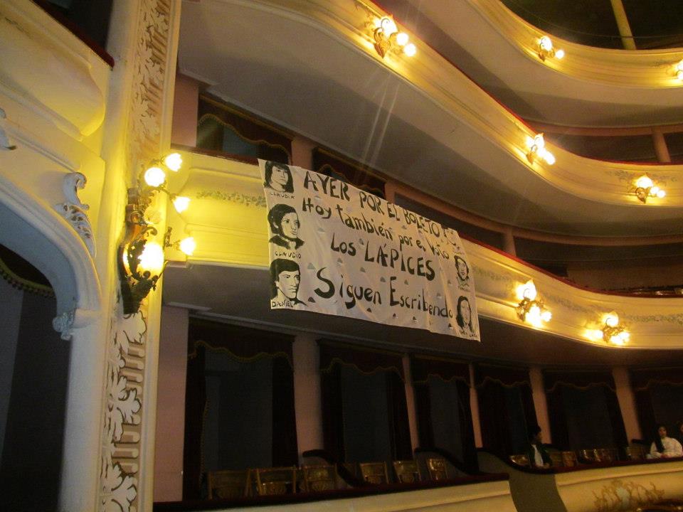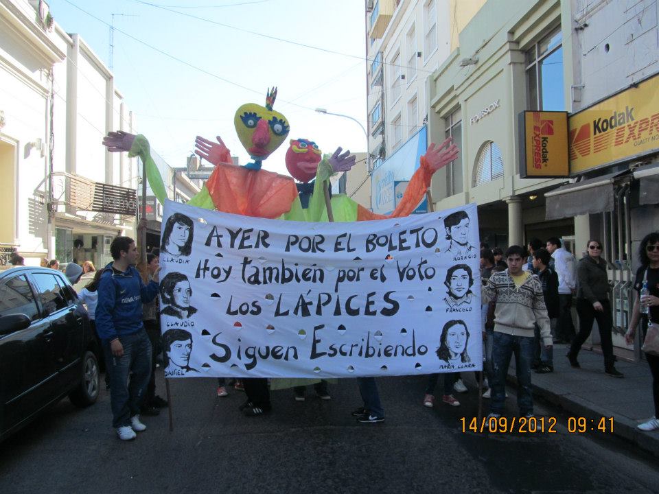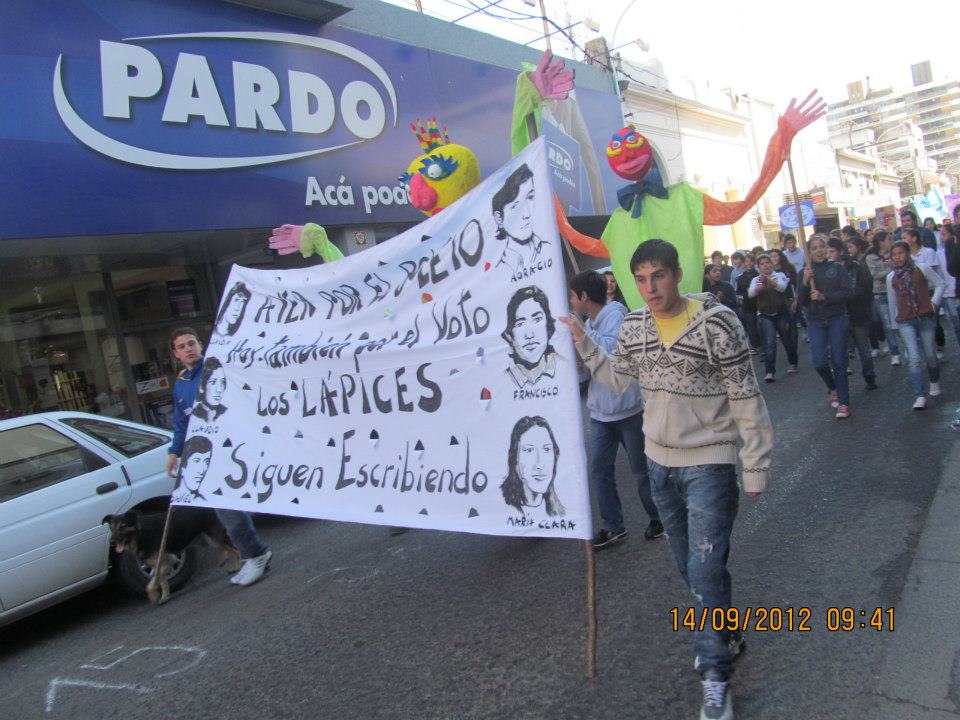 La compañera Giglio nos relataba que “el jueves 13 fuimos con una función al Barrio Santa Rosa donde se congregaron los chicos del programa Envión de todas las zonas; y el viernes 14, con motivo del cierre en San Nicolás, se llenaron las calles de adolescentes de distintas escuelas secundarias que junto a sus profesores hacían bailar a sus marionetas acompañando el recuerdo de los siete pibes desaparecidos muertos en la noche de los lápices. Al ritmo de la batucada y los cánticos avanzaba como cabecera de la caravana la bandera homenajeando a Claudia, Clara, Claudio, Horacio, Víctor, Francisco y Daniel que estuvieron presentes también en la función de Cineamano, que disfrutamos con mucha emoción desplegada también por Julieta con su arte tan innovador”.