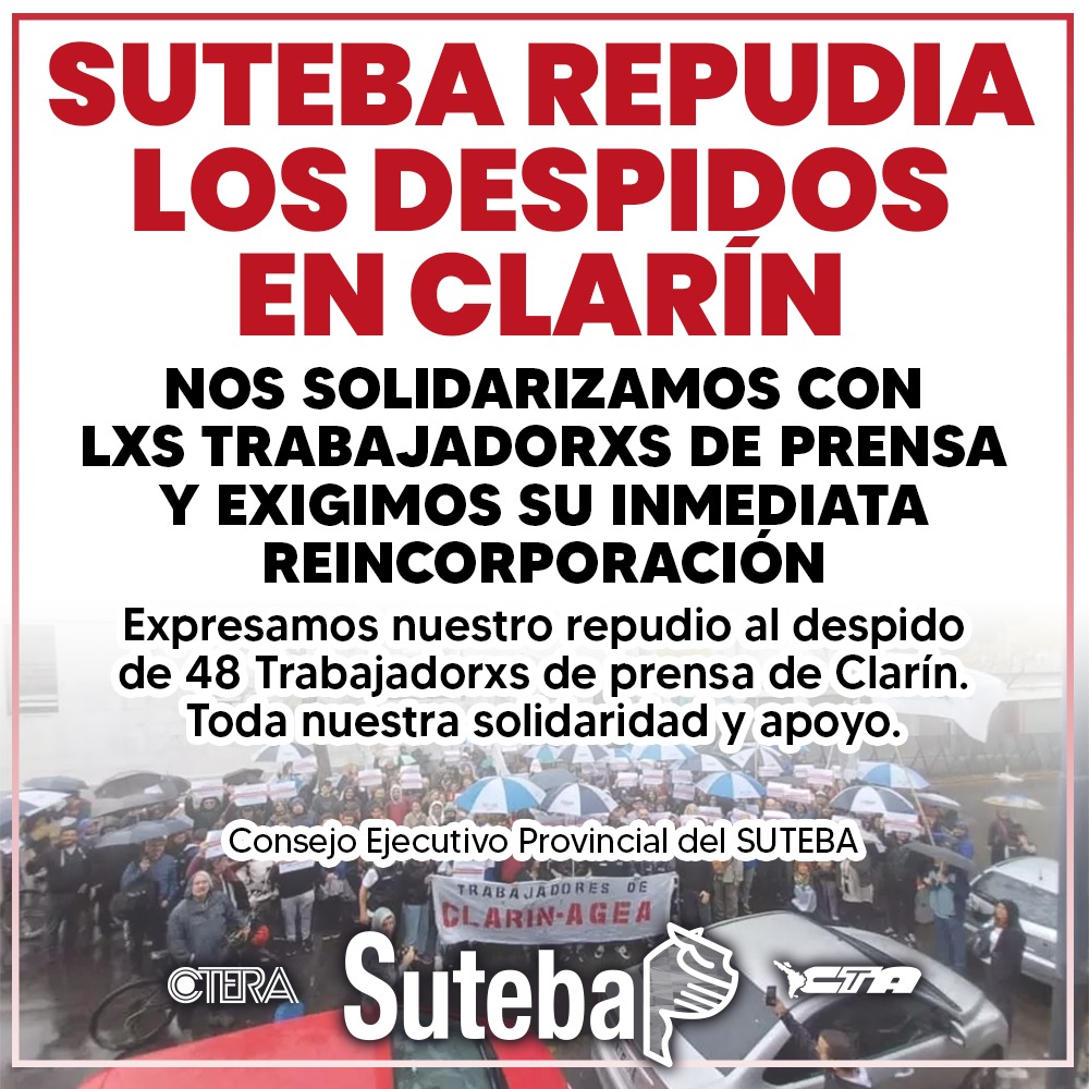 Desde el SUTEBA, junto a la CTERA y la CTA-T, repudiamos los despidos masivos en Clarín y exigimos la inmediata reincorporación de todxs lxs Trabajadorxs.